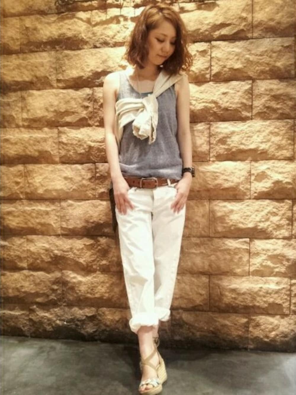 リラックス感のあるボーイズパンツにタンクトップをあわせてラフさを出しました☆ 肩かけしたシャツはアクセントを加えるポイントです!