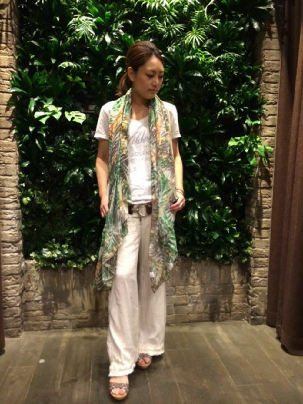 ロゴプリントTとリゾート柄のストールのお得なSET♪ 麻のワイドパンツと合わせて、夏を先取るスタイリングです!