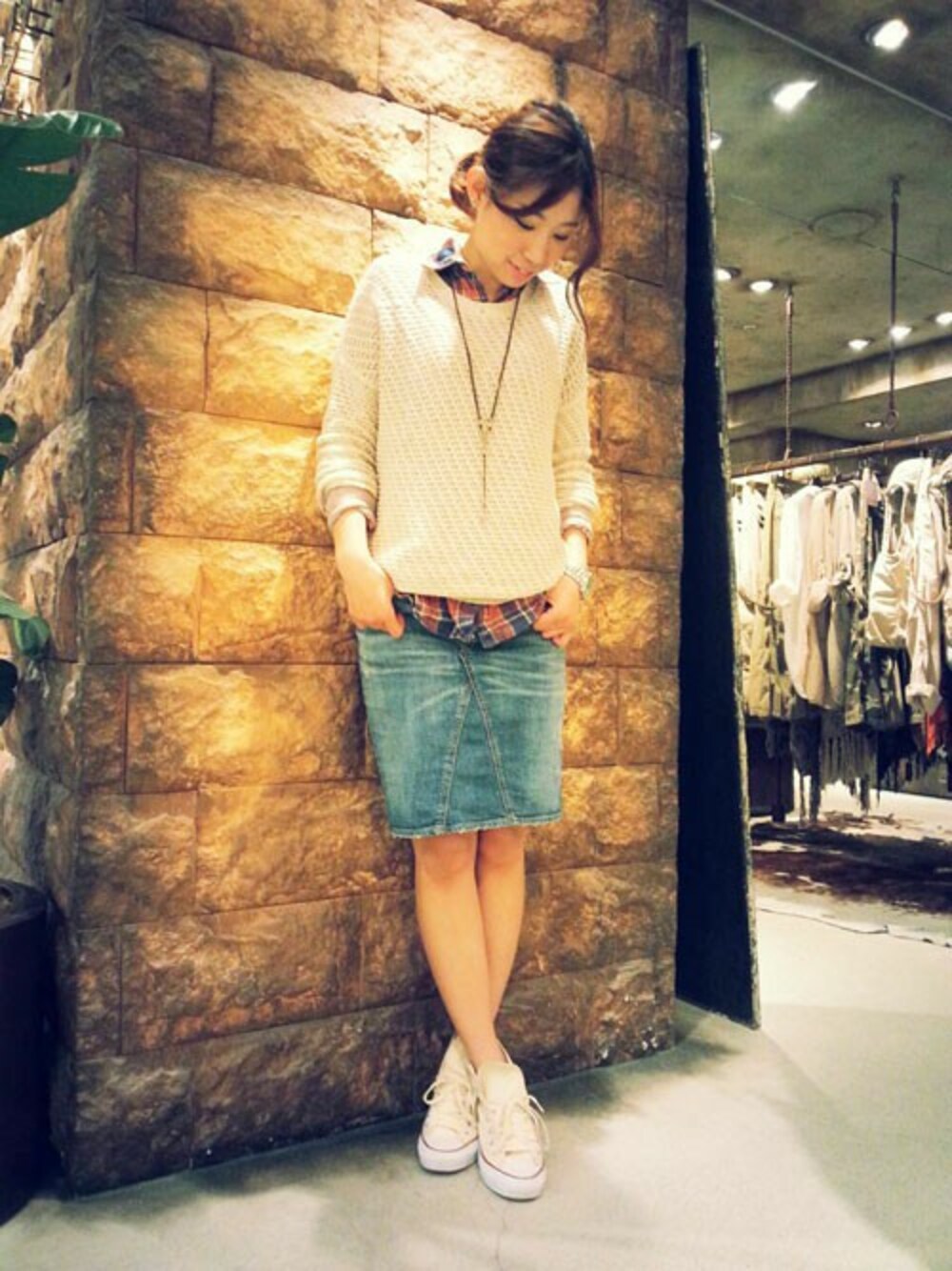 ひざ丈けのデニムスカートをスニーカー合わせでボーイッシュにしてみました。 赤のチェックのシャツをのぞかせて、女のらしさも忘れずにプラス☆☆ 楽ちんで愛嬌あるコーデの完成です!!