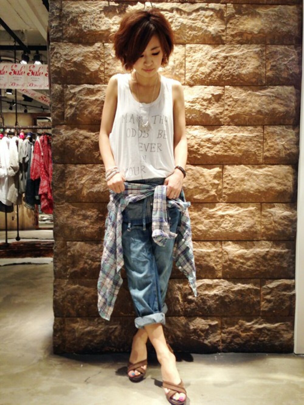 オーバーオールを着崩して遊んでみました☆ ぱっと見た感じはまるでボーイズデニムのようです! シャツを腰巻にして、さらに自然な着こなしに演出しました。 これなら着回しが効くのでマンネリせずに、楽しめます。