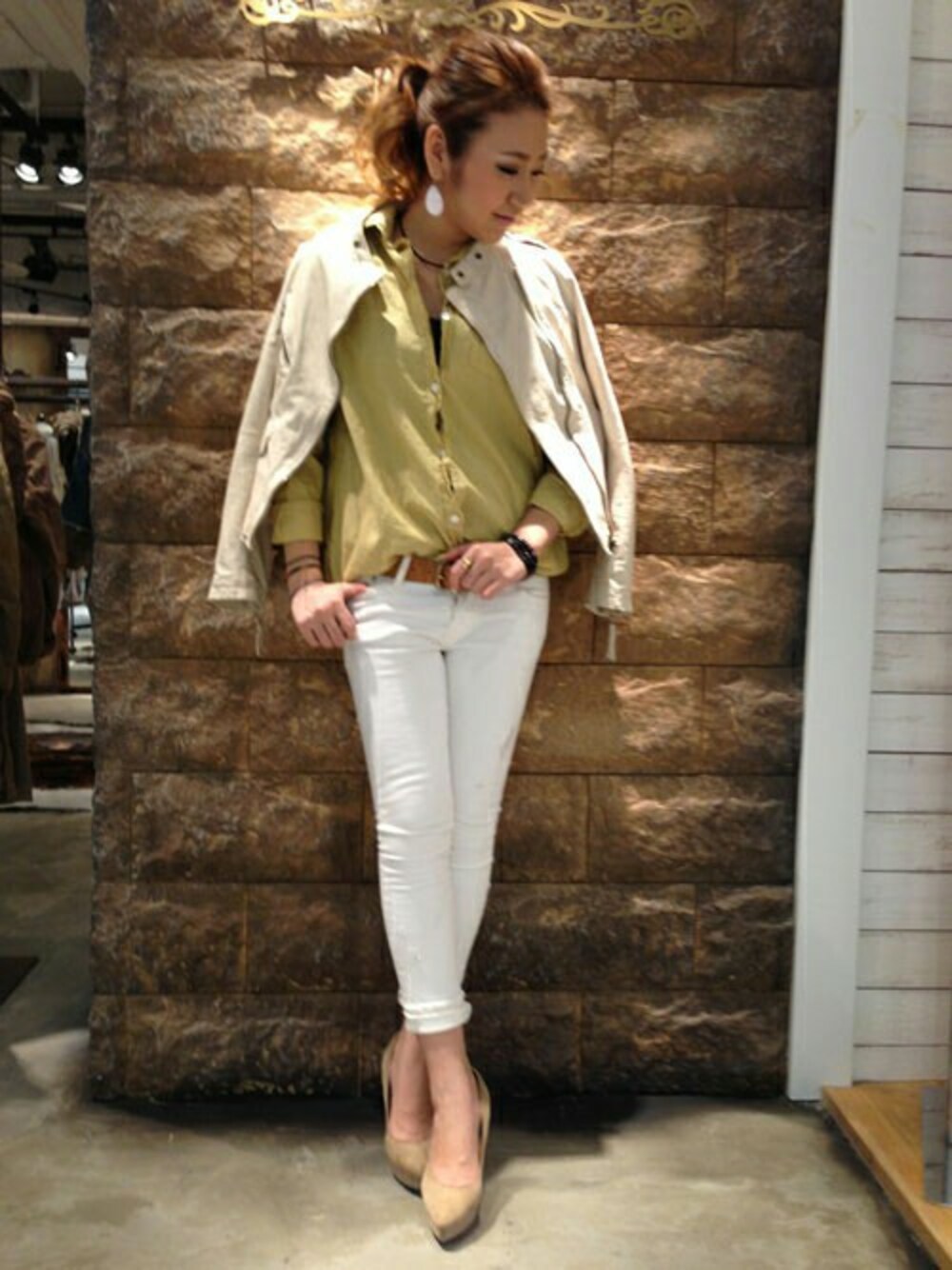 マスタードがアクセントのベーシックスタイル☆ホワイトデニムと合わせて大人にまとめました。
