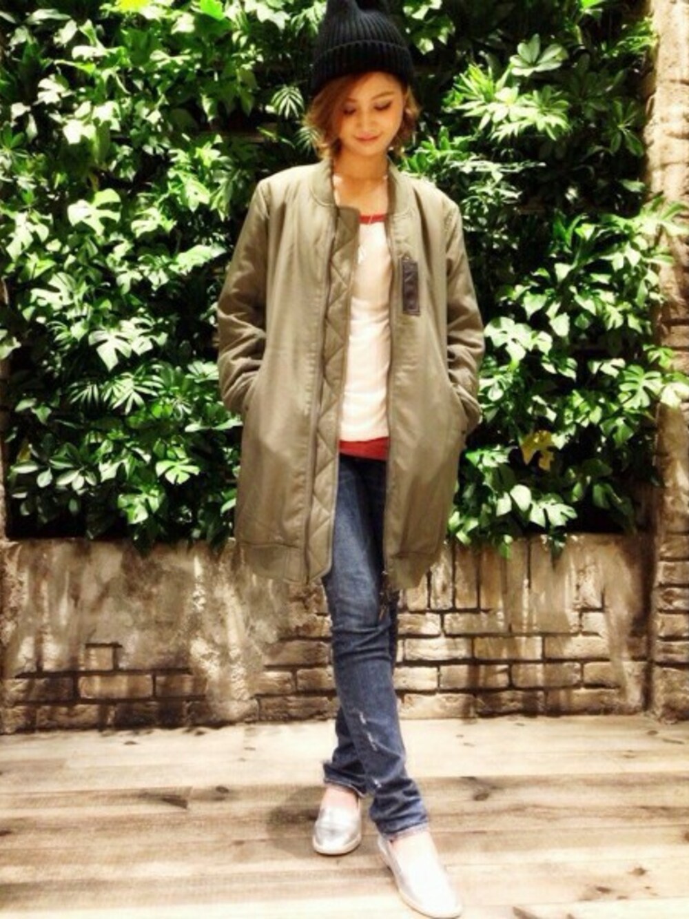トレンドのMA-1をコーディネート。 goaでは他では見られないロングバージョンを展開しています! まわりと差をつけたい人にはオススメの上級者コーディネートです☆