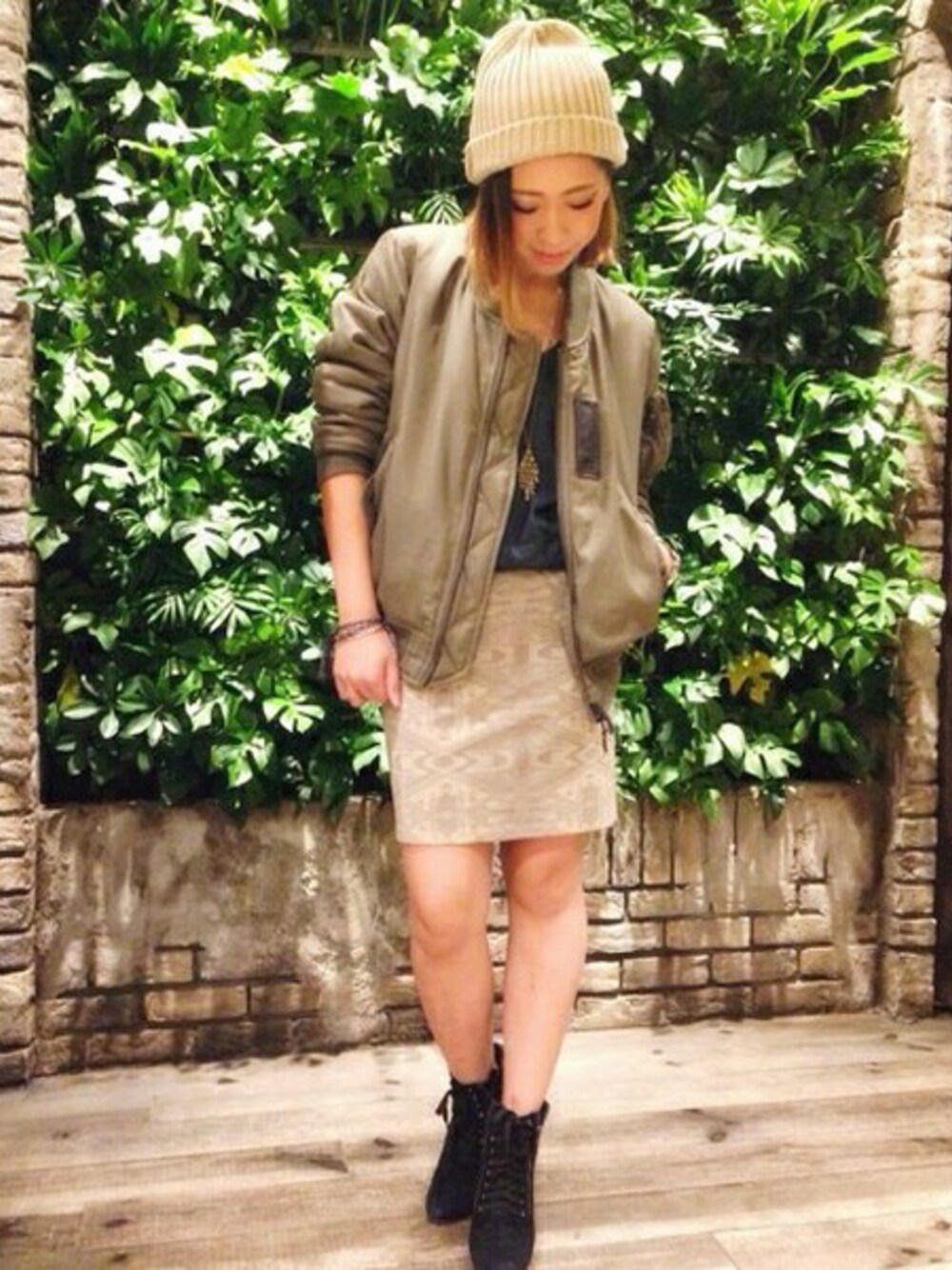 トレンドのMA-1&ペンシルスカートをコーディネートしました! スカートはgoaらしさを出したネイティブな総柄をチョイス。 モードテイストなスタイリングですが、ニットキャップでカジュアル感をプラスしました☆