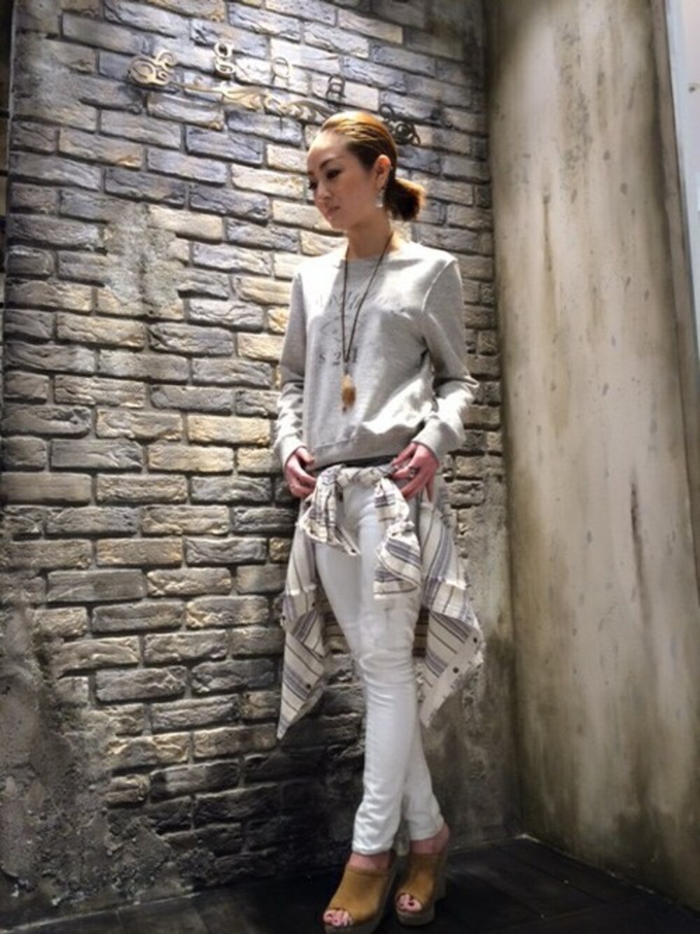 2014SS新作を使ったスプリングコーデ☆ 春らしくホワイト系でまとめました! 腰に巻いたストライプのシャツがpoint!