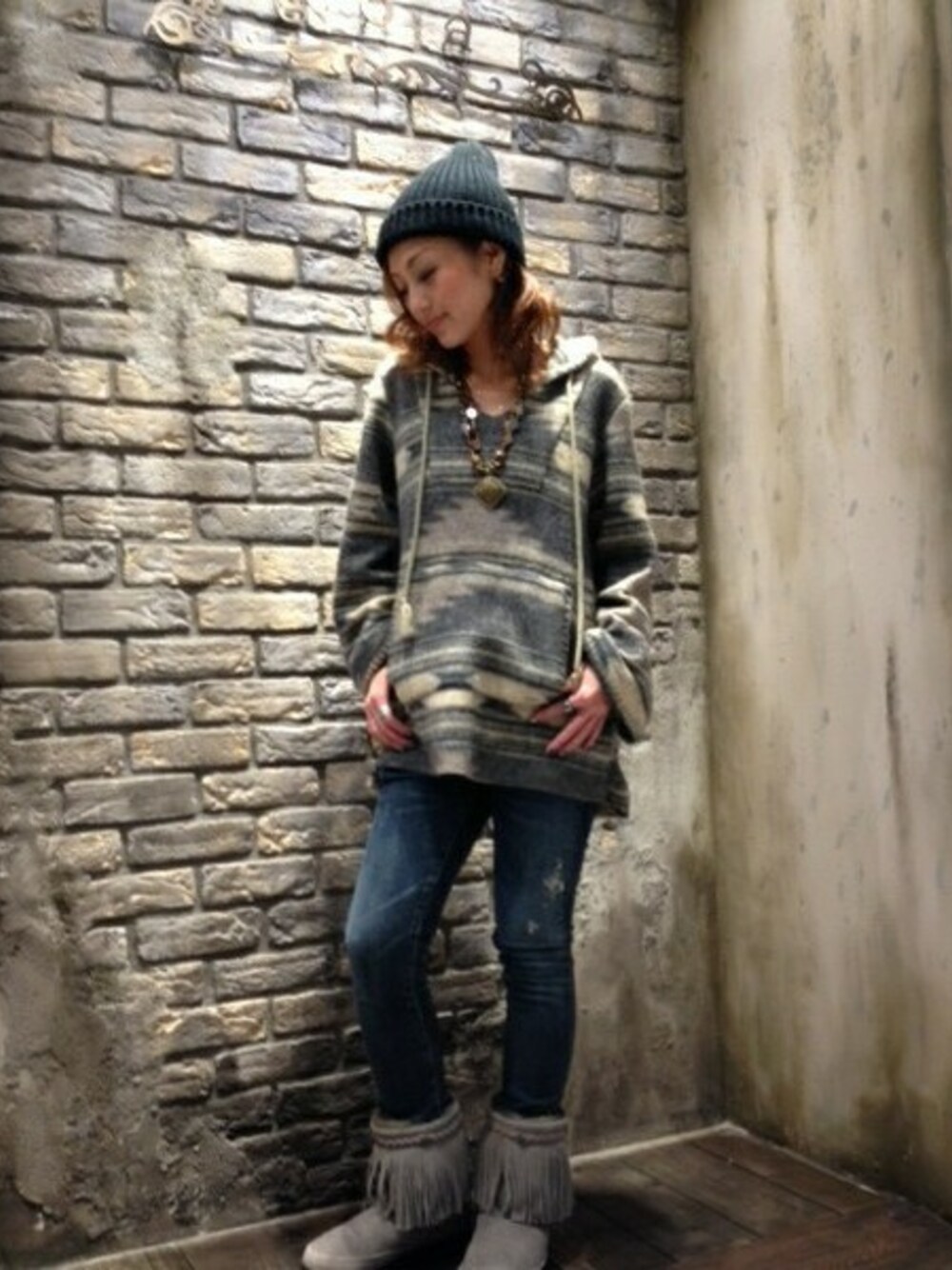 goaらしいネイティブ柄のパーカーが雰囲気たっぷりのコーディネート! ボトムはシンプルにデニムあわせで、フリンジムートンブーツで、季節感を出しました☆