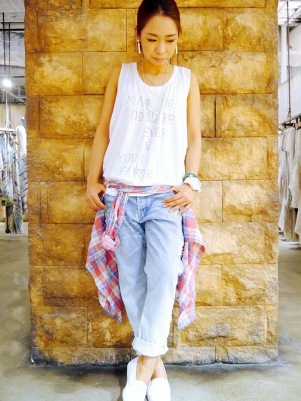 ホワイトを基調にしたカジュアルコーデ☆ ボーイズデニムに、ホワイトのスリッポン合わせは、 カジュアルアイテムでも女の子らしさがプラスできて、とってもオススメです☆
