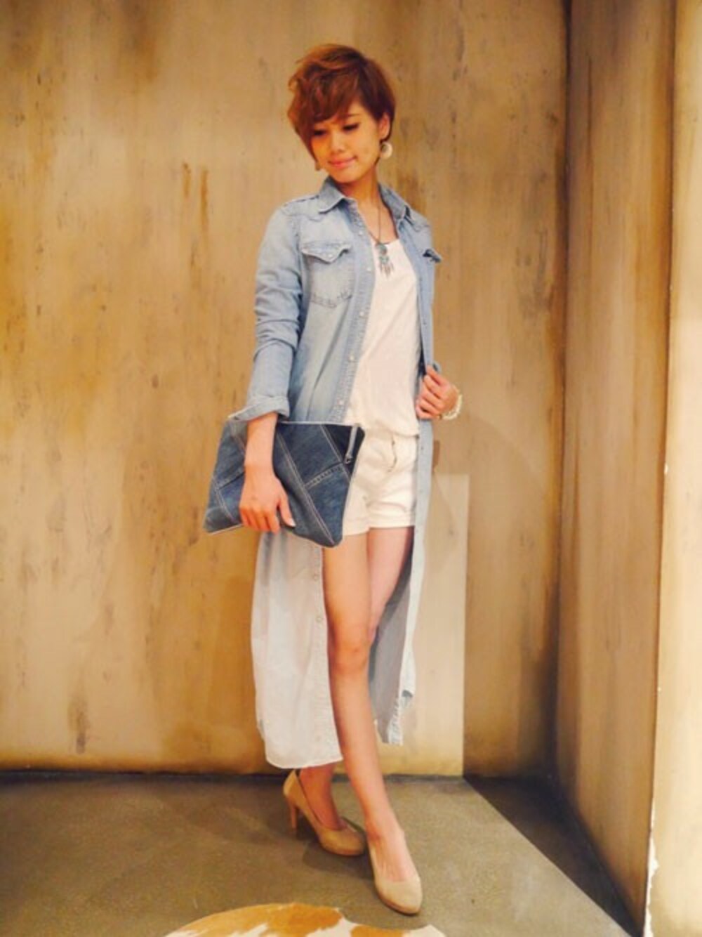 グラデーションデニムのマキシシャツワンピースを前開けで羽織としてコーデしてみました☆ マキシ丈でボリュームがあるので、インナーやボトムはショーパンでコンパクトにするのがポイントです。 クラッチ・ヒール合わせで大人っぽくしました。