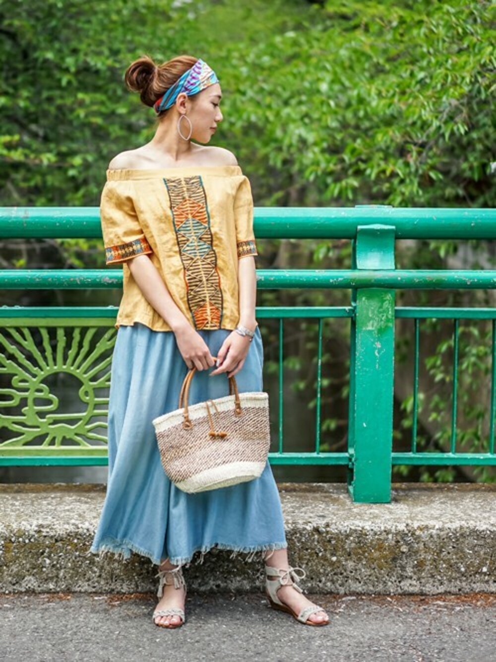 夏にぴったりなイエローカラーのオフショルダートップスがポイント。 カゴバックでさらに季節感をプラスしました。