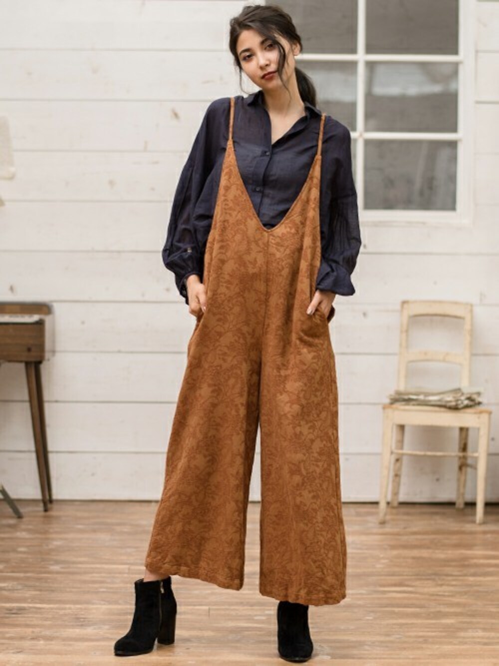 ボタニカル柄のオールインワンにシルクシャツを合わせたコーディネート。 バルーンスリーブを活かせるオールインワンにトレンドのボタニカル柄を入れたスタイルは秋からオススメ! ネイビー×キャメルの組み合わせとさり気なく入った柄がポイント。