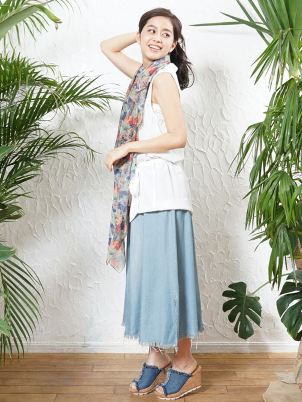 シンプルなノースリーブシャツはスッキリとした印象をプラス。 フラワー柄ストールは、夏らしい雰囲気をグッと惹き立て冷房対策にもピッタリです。