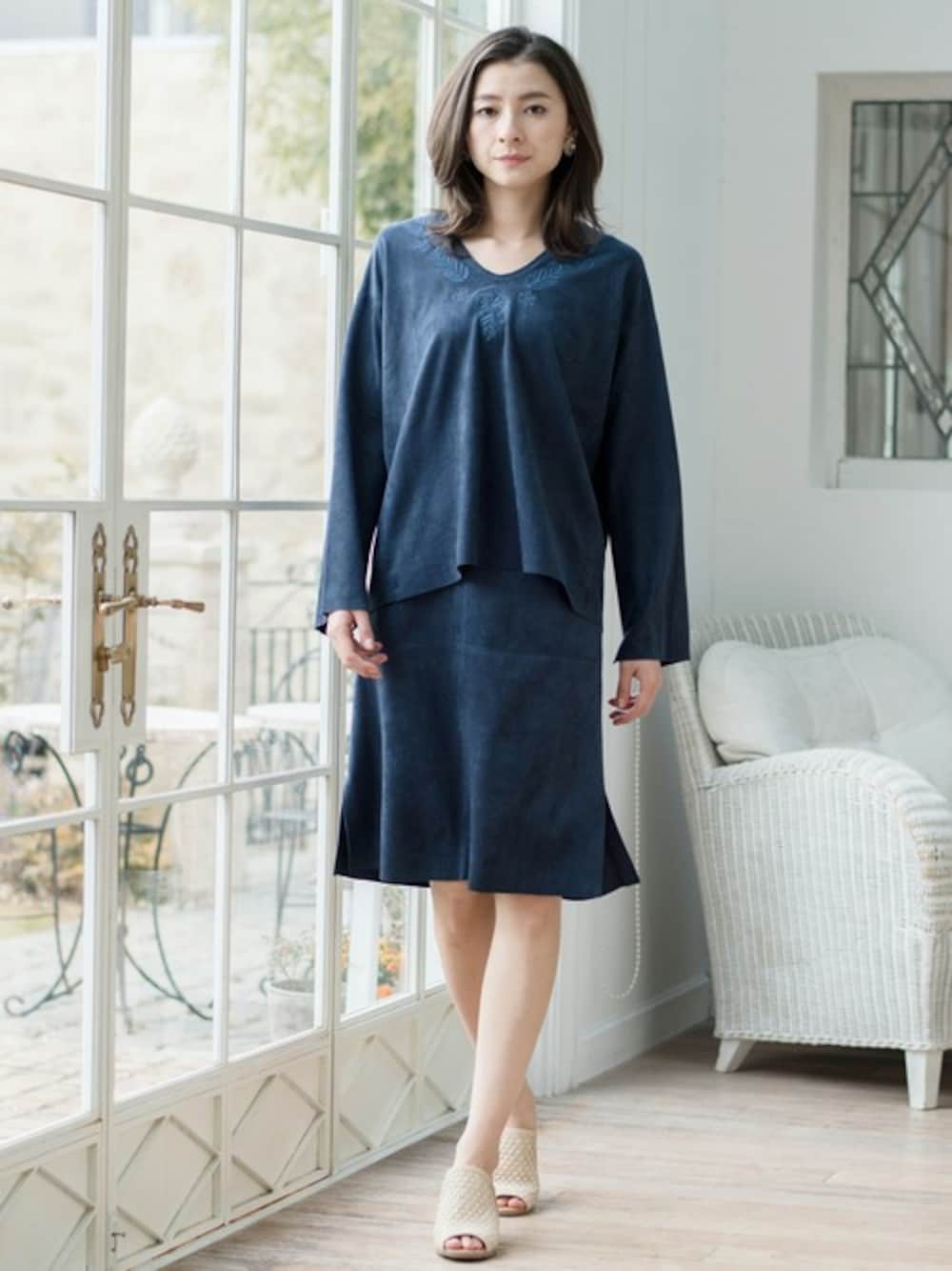 贅沢に刺繍を装飾したエコスエードプルオーバー。 同素材のスカートで品のある印象をプラス。 晩夏シーズンの先取りコーデにピッタリな逸品です。
