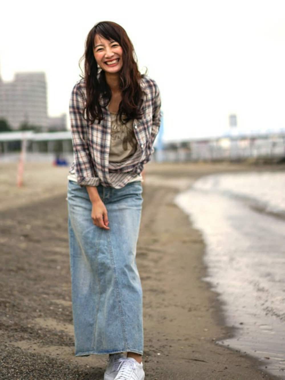 goaチェックシャツコーディネート☆ 裏地はストライプになっているので、ロールアップするのがマスト。 2wayで着れるカシュクールタイプなので、ロンスカとの相性もGOOD!