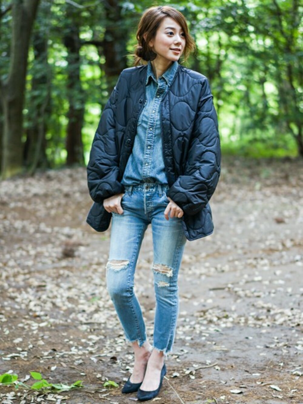 デニムONデニムスタイルはダメージ・フレイドヘムを取り入れる事でこなれ感を演出。 キルティングジャケットは今っぽいオーバーサイジング。 リバーシブルなので気分によって変えれるのも嬉しいポイント。 トレンドのゆったりアウターは細身のパンツで女性らしく着こなすのがGOODです。