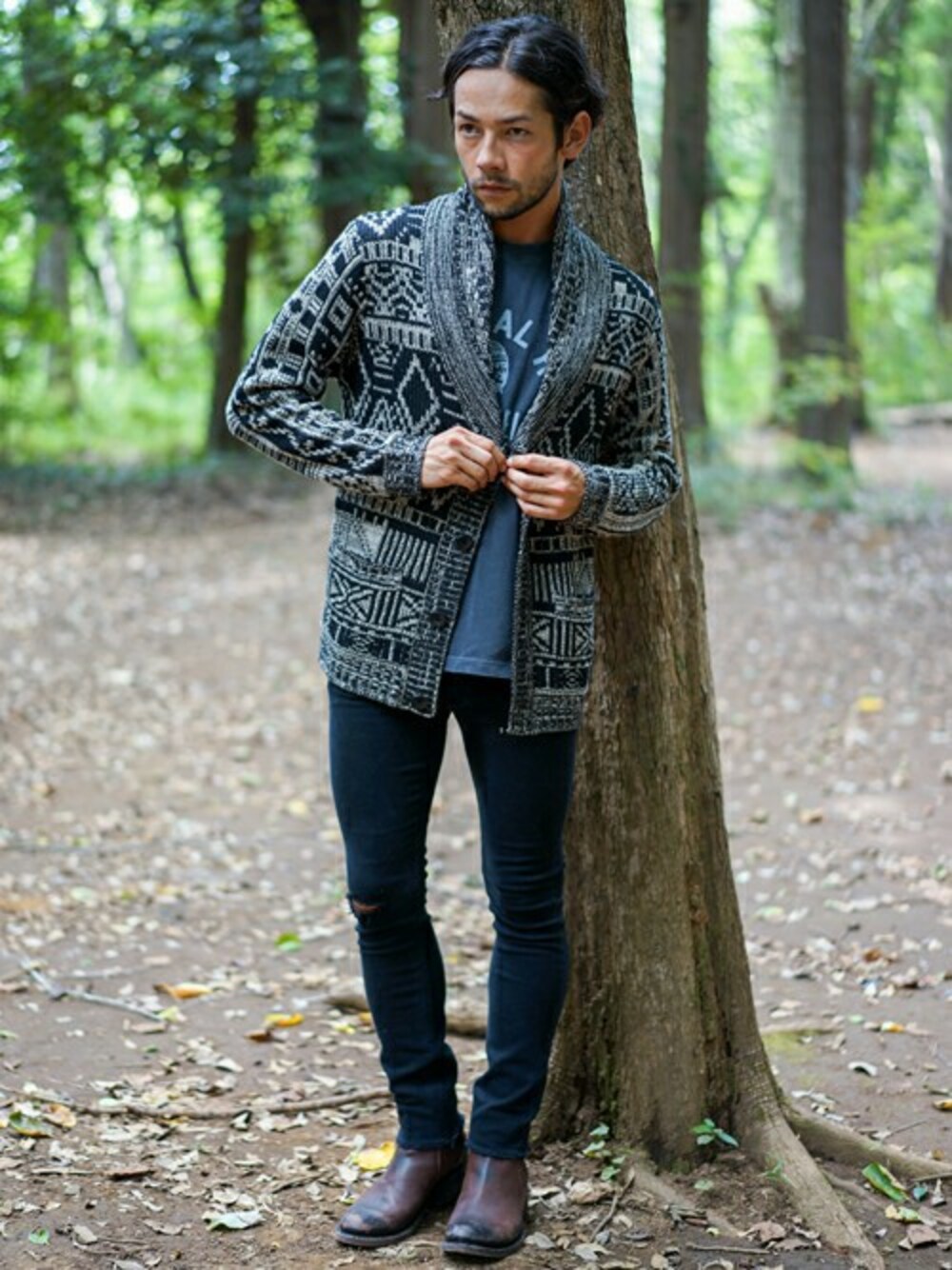 アフリカンなトライバル柄ニットで差をつけよう。 万能なニットカーディガンも個性派テイストを選ぶことで一気にこなれ感が出ます。 大人カジュアルにモノトーンブラックコーデでまとめました。 レザーブーツはあえて茶色でくずしてみましたが、オールブラックもGOODです。