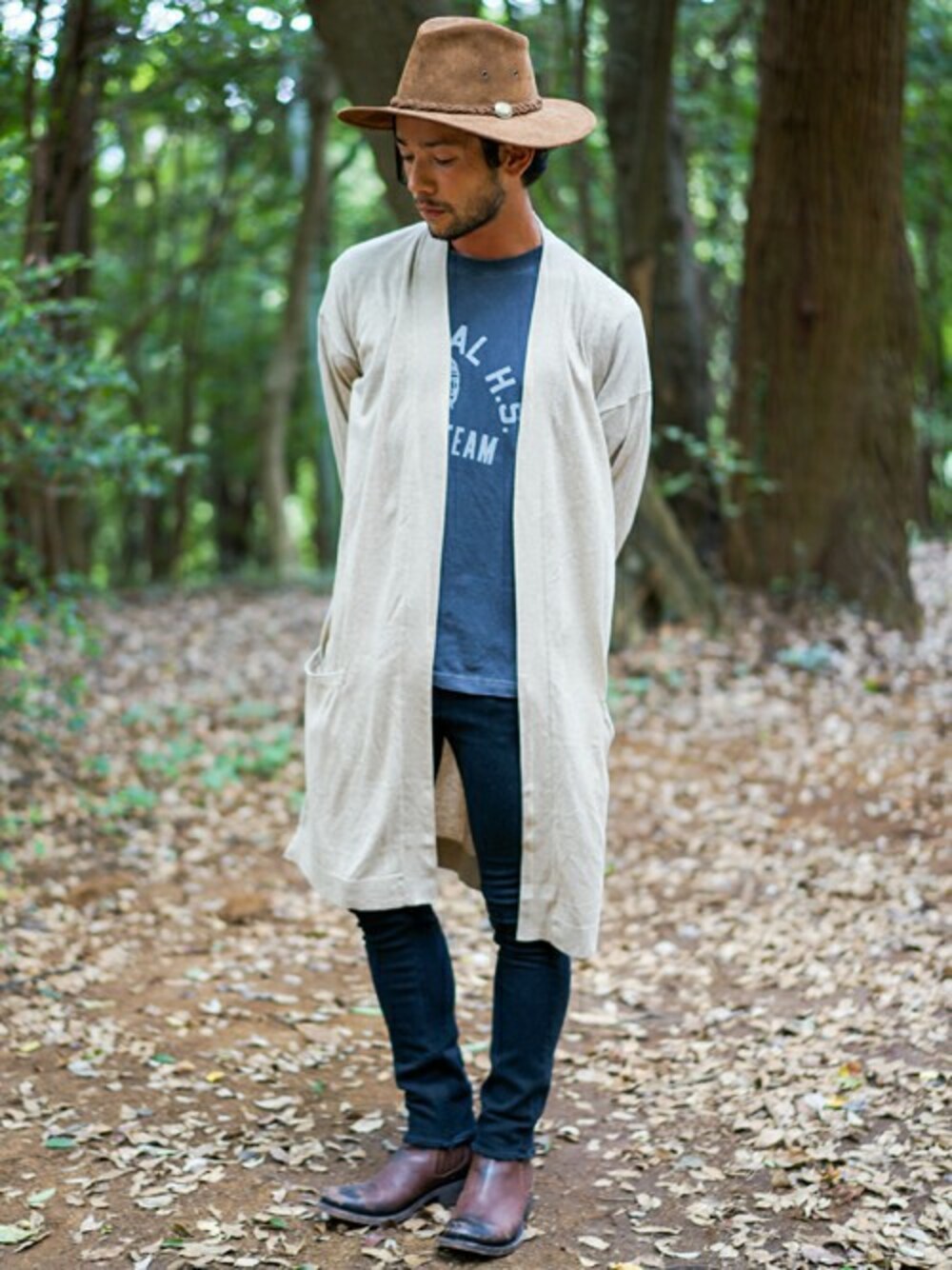 肌触りの良いニットガウンでカジュアルボヘミアンコーデ。 少し肌寒く感じ始める晩夏からさらりと羽織れる軽さが嬉しい。 冬はこの上にロングコートがおすすめです。 トップス×ボトムを同系色に合わせてIラインの縦長効果を出すのが◎