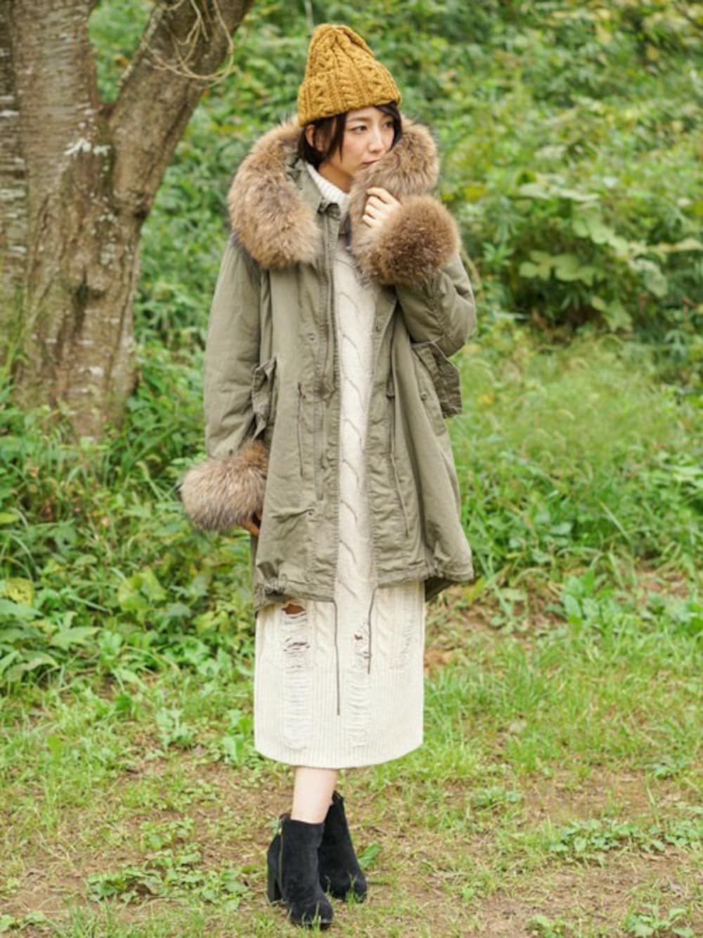 ニットワンピース×スペシャルモッズで可愛めカジュアルコーデ。 程よくはいったダメージのケーブルニットがエッジが効いて個性的です。 ニット帽と合わせてとことん暖かガーリーに。 足元はヒールを合わせて女性らしくがモットーです。
