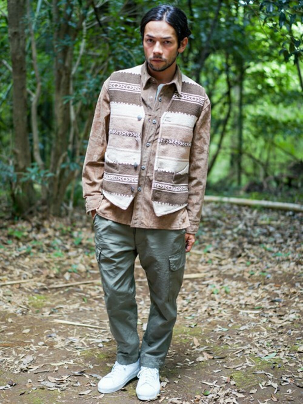ワンランク上のネイティブカジュアルコーディネート。 キャメル×カーキの黄金バランスにベストをON。 スエードジャケットとリメイクベストの組み合わせが絶妙です。 ホワイト小物で抜け感をプラスしました。