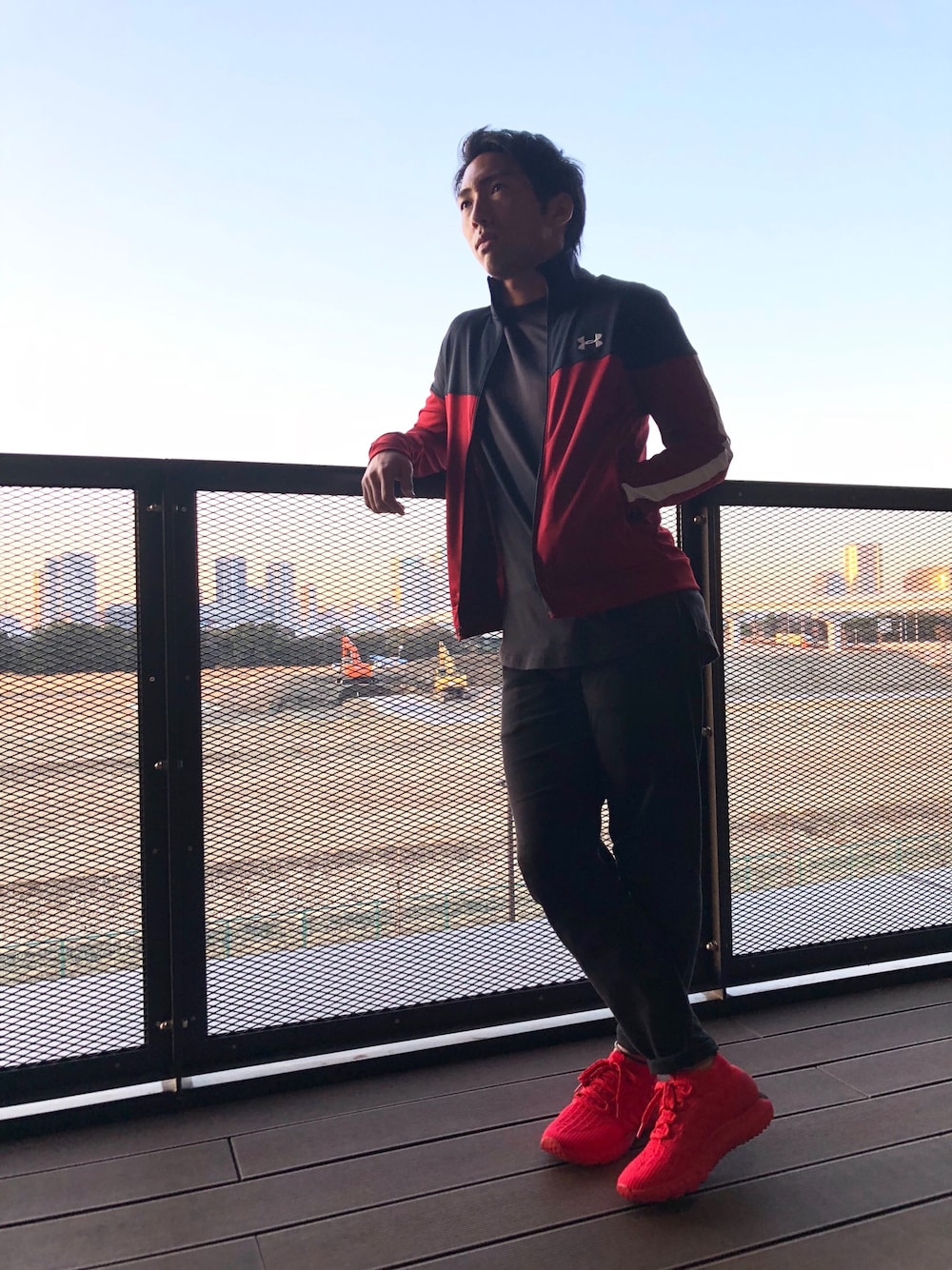 アンダーアーマーのトラックジャケットです! 動きやすくて、運動時でも着れそうです! 靴もアンダーアーマーで、履いて走るとふかふかした感触がして、気持ち良いです! もちろん、普段履きとしてもカッコ良くて履いてます!