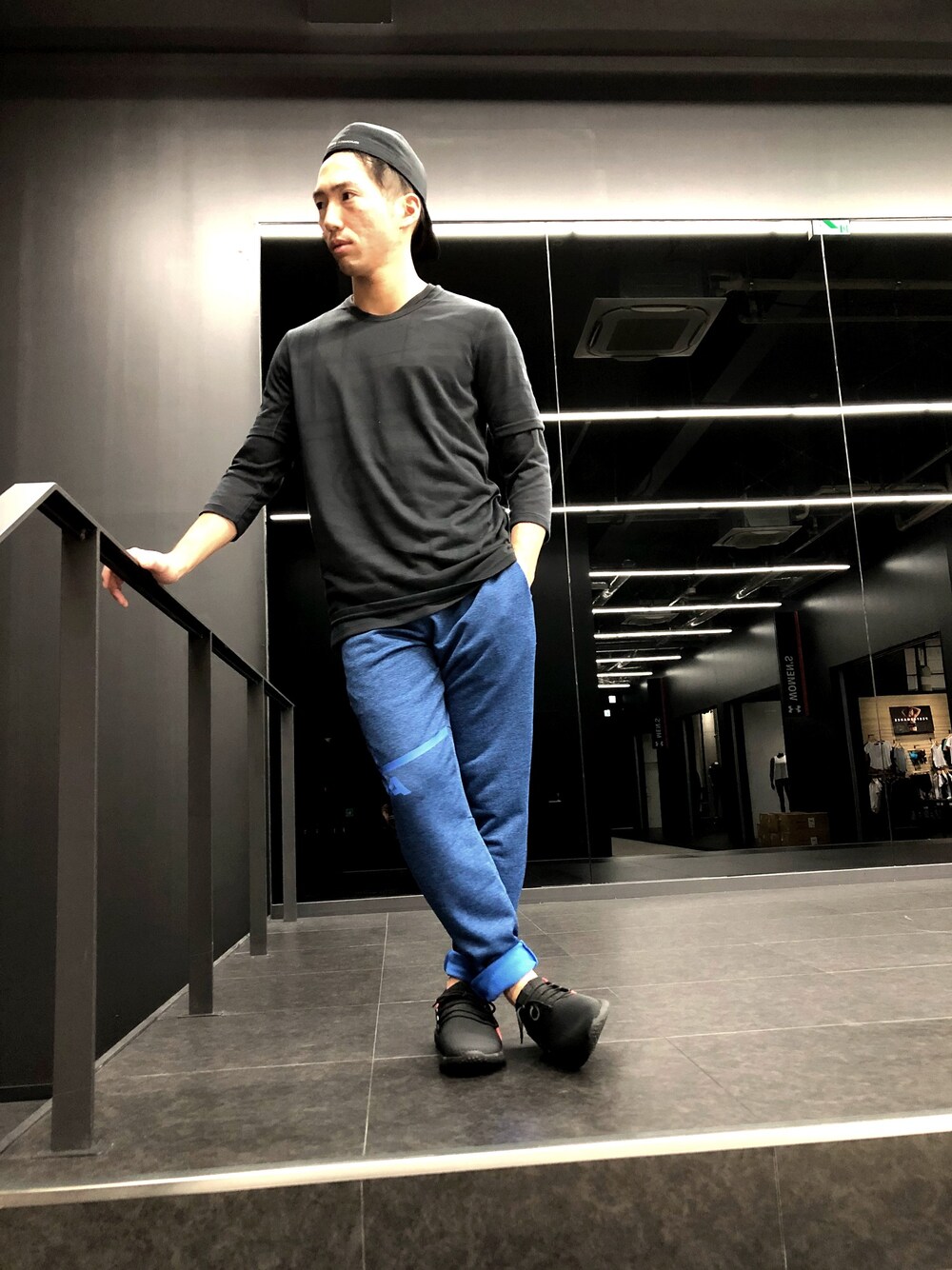 青と黒の組み合わせで、この色の組み合わせは良くやります。 スウェットパンツの生地の感じが好きで、履いていると気持ちいいです。 シューズも足についてくるようにフィットしてくれます。