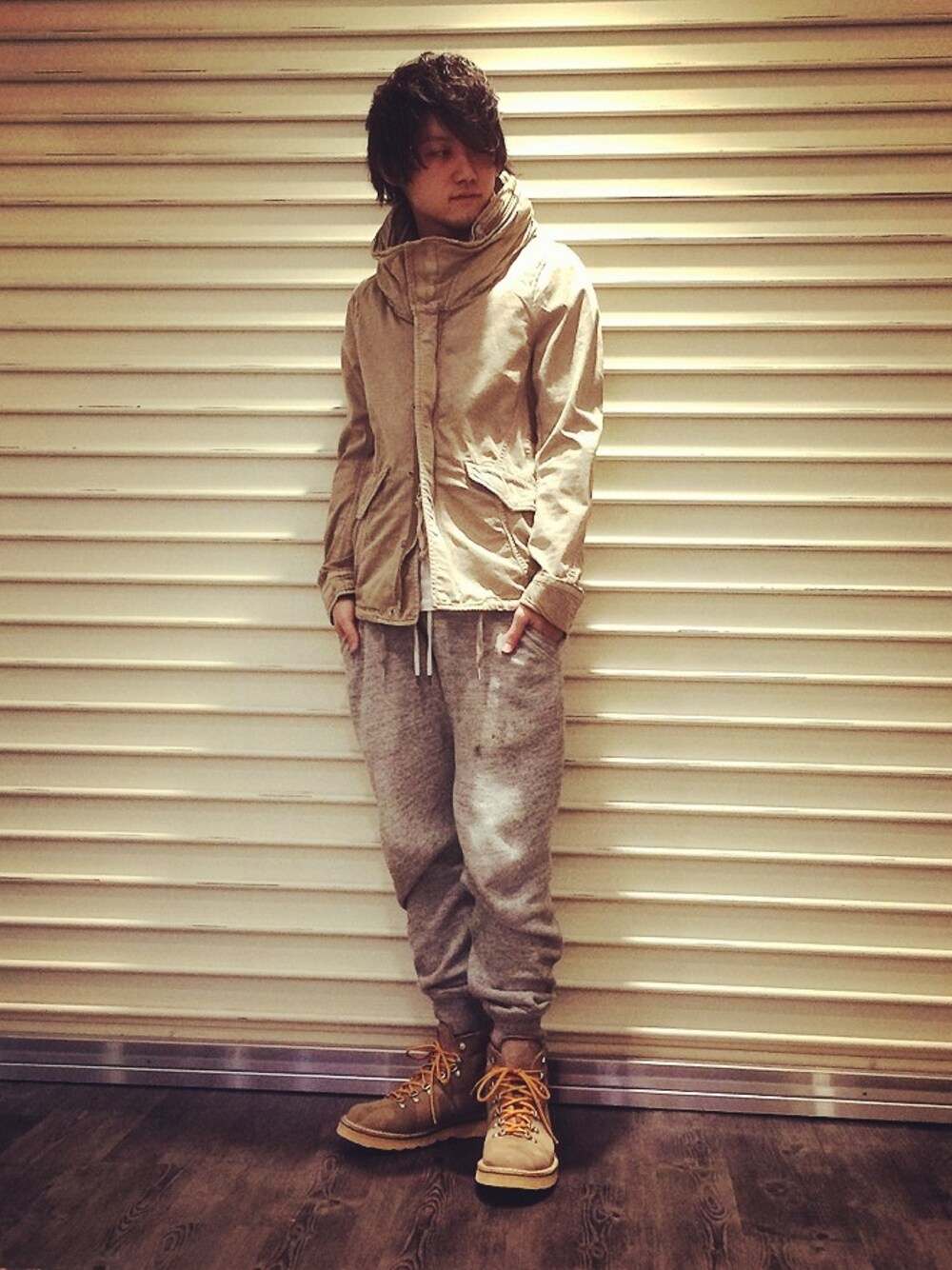 武骨なジャケットをイージーパンツではずしました! 足元にはブーツでトレンドに左右されない雰囲気を出しました!