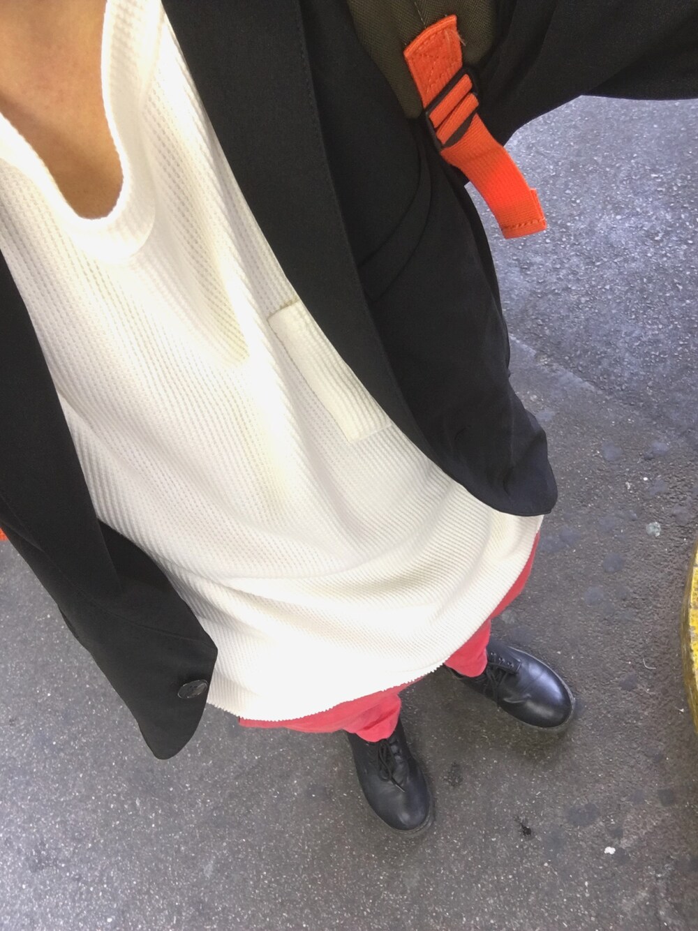 上半身がおとなしめの色だったのでパンツに差し色を入れてみました