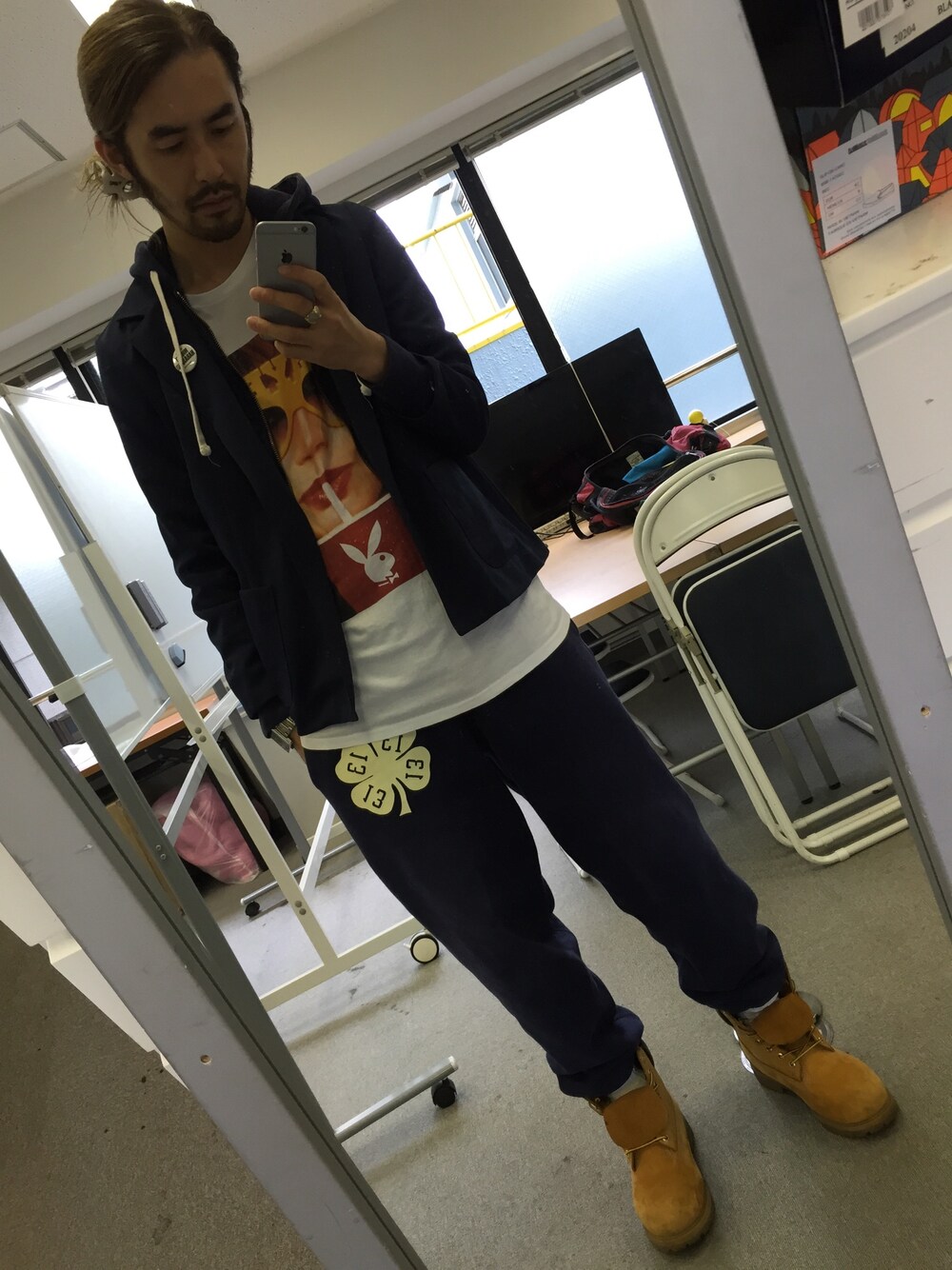 ・ジャケット…古着 ・パーカー…古着 ・Tシャツ…PlayBoy ・スウェットパンツ…古着 ・ブーツ…Timberland