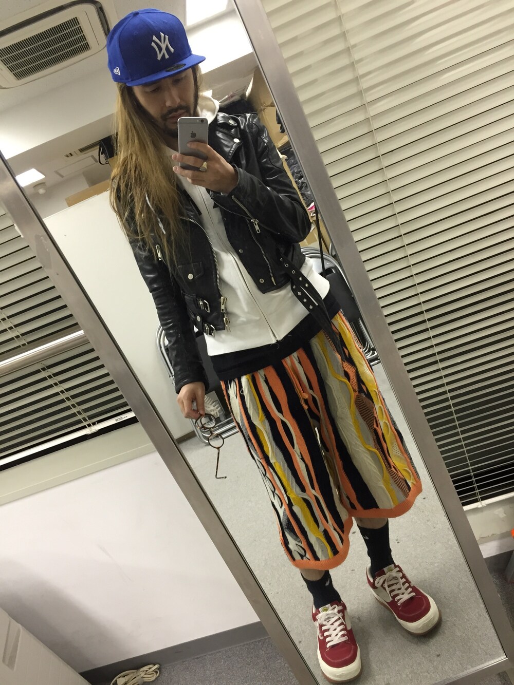 ・ライダースジャケット…monomania ・パーカー…Spinns ・Coogiのショーツ…古着 ・キャップ…NewEra ・スニーカー…NorthWave