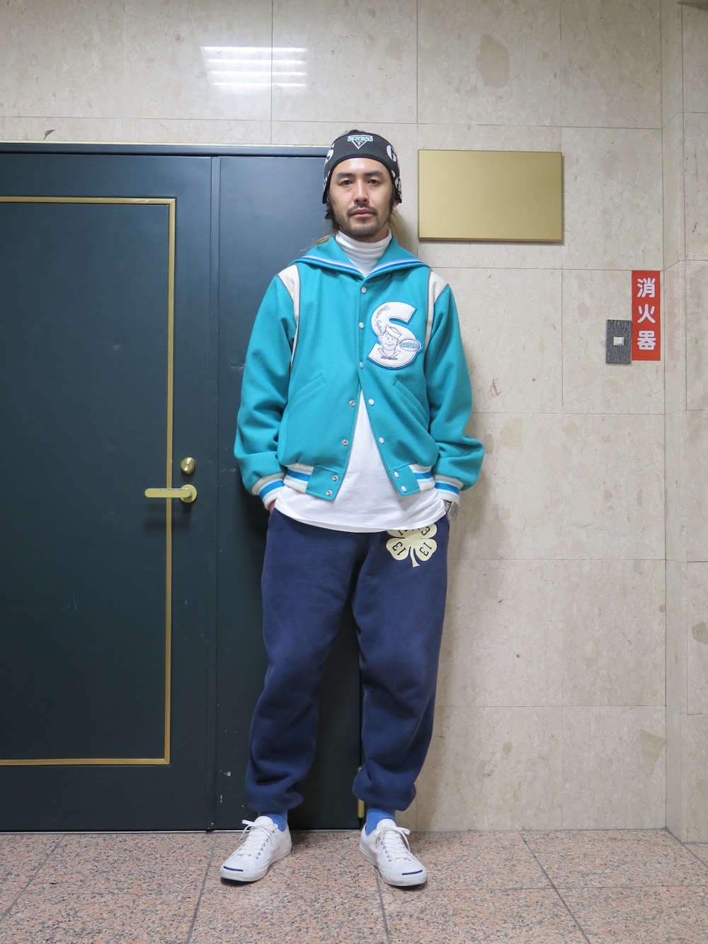 ・スタジャン…Sailors(セーラーズ) ・タートルネック…??? ・スウェットパンツ…古着 ・ヘッドバンド…リメイク ・スニーカー…JackPurcell(コンバース)