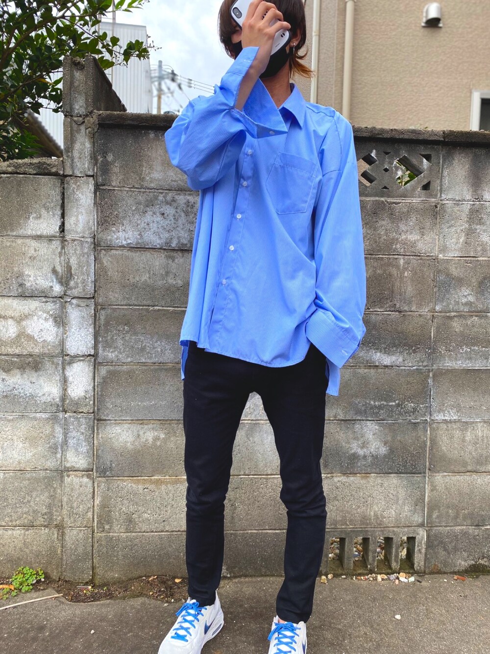 秋コーデです 今日もオーバーサイズビッグシルエットのシャツに、黒デニムのシンプルかつ、スタイル良く見えるコーデです! 足元を遊ばせたかったので、NIKEのスニーカーを履いています!