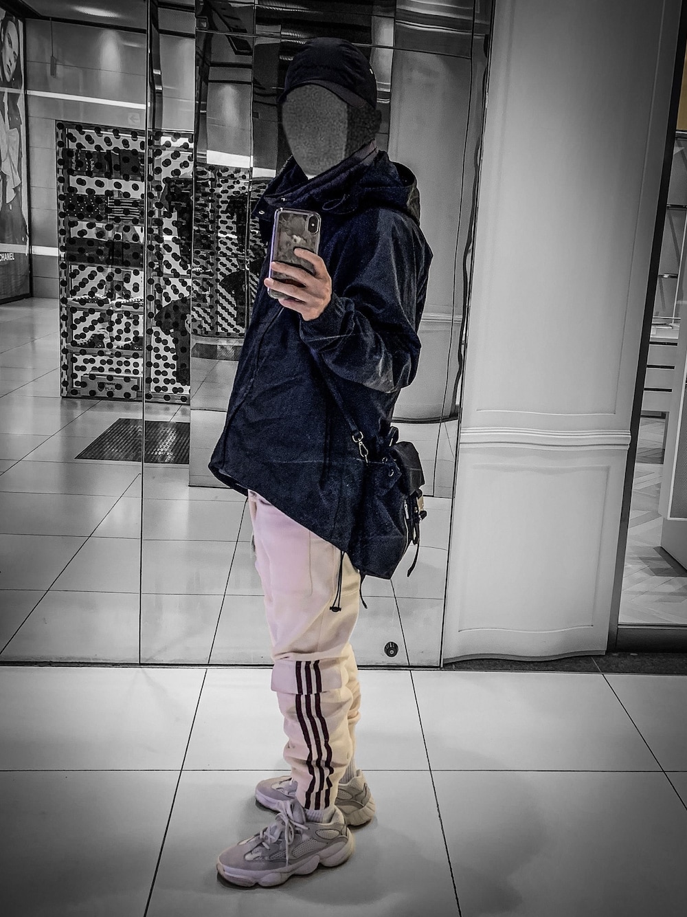 adidas x IVY PARKのパンツがとっても良い感じだよ! 誰も写真撮ってくれる人がいないから、鏡越しに自分で撮ったよね。