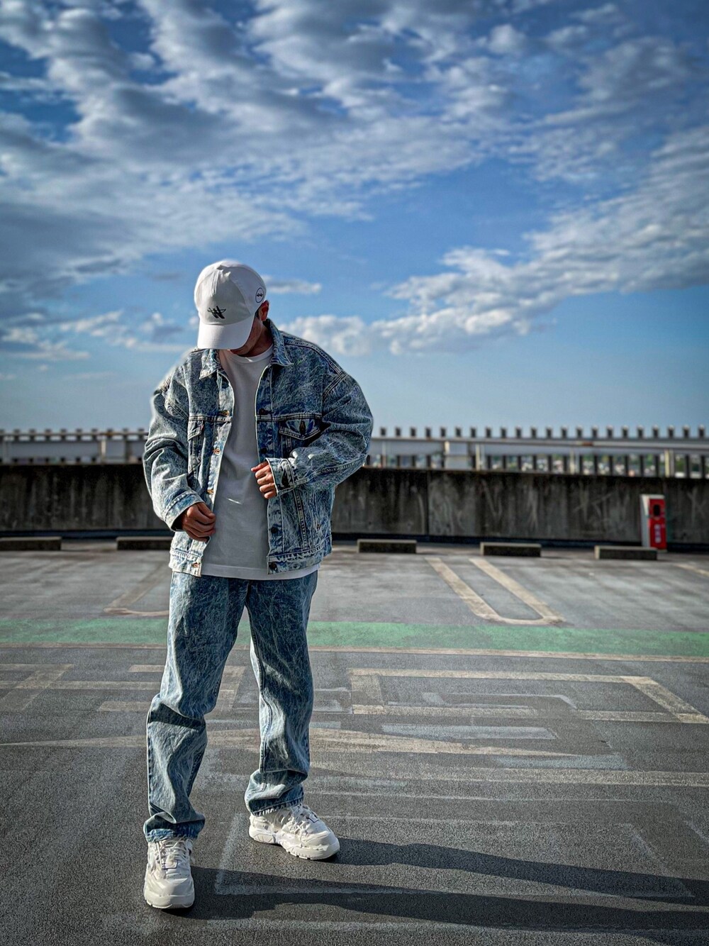 vintageのlevi'sのジャケットとパンツ。別々に買ったんだけど、セットアップで着たかったんだ。ケミカルウォッシだよ!