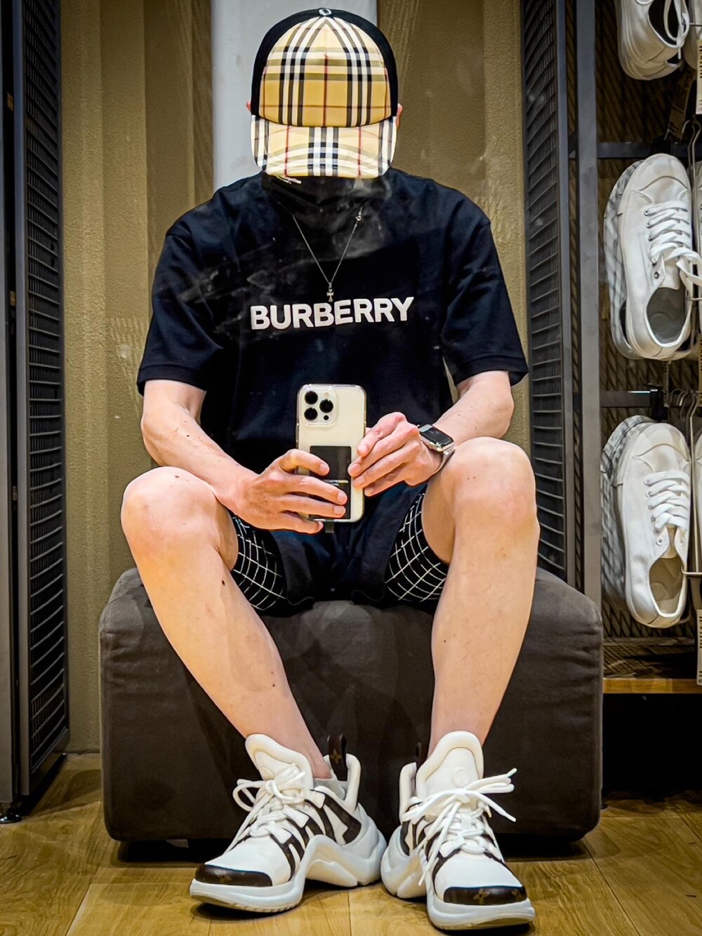 今気に入っているアイテム全部入りです。 LVのスニーカーはアークライトです。新型も出ましたが、これはこれで気に入っています。 バーバリーのTシャツはサイズXSです。