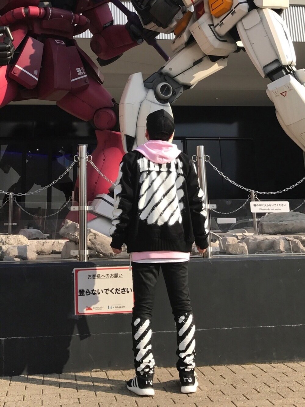 大阪旅行の最終日。 神戸空港から茨城に帰る前にNIFRELに寄って様々な生物とガンダムと戯れてきました! 今日のコーデは、 off-whiteのアウターとanti social social clubのパーカー、asosのTシャツの重ねた着丈のバランスと差し色のピンクです。 asosはロング丈を詰めました。