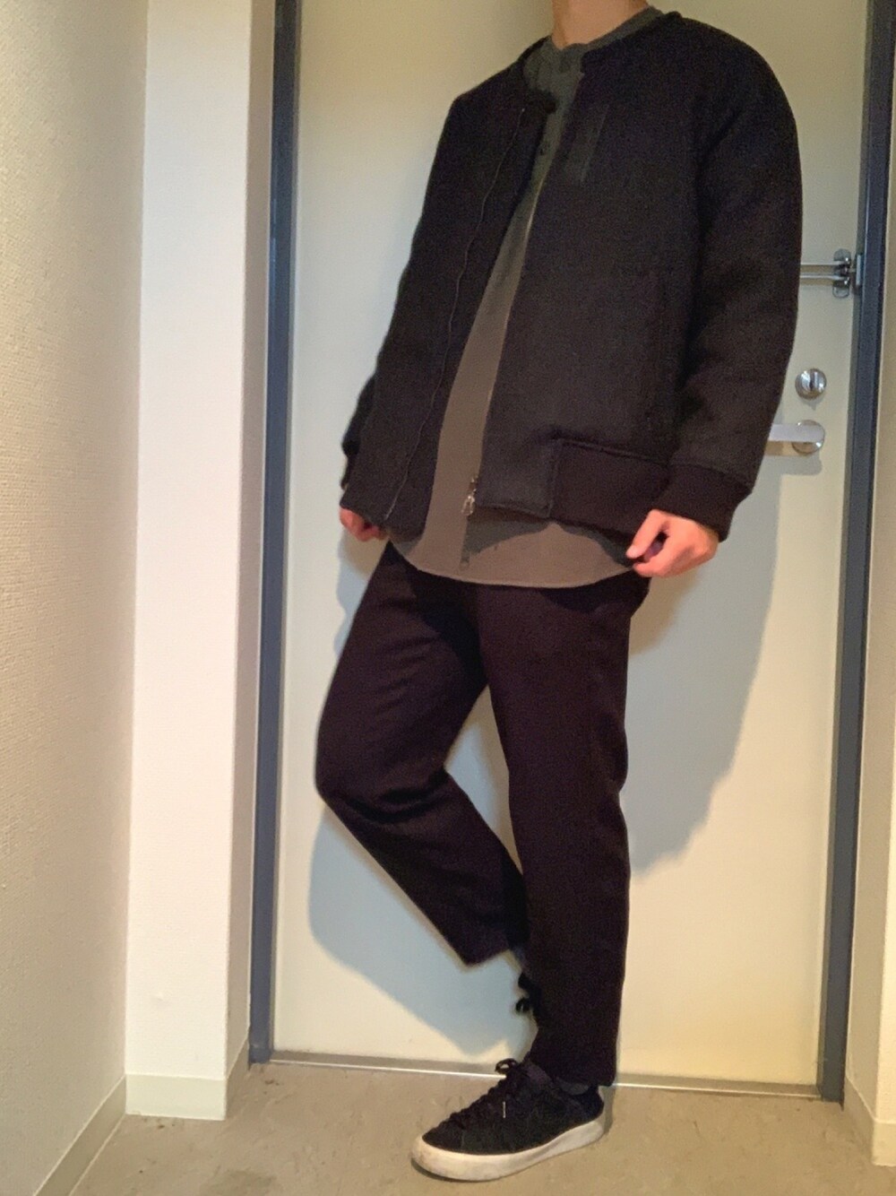 夜のお出かけコーデ✨ DOOPZのブルゾンに、ユニクロのTシャツをレイヤードしました! 足元はスラックスとスニーカーでシンプルに😎