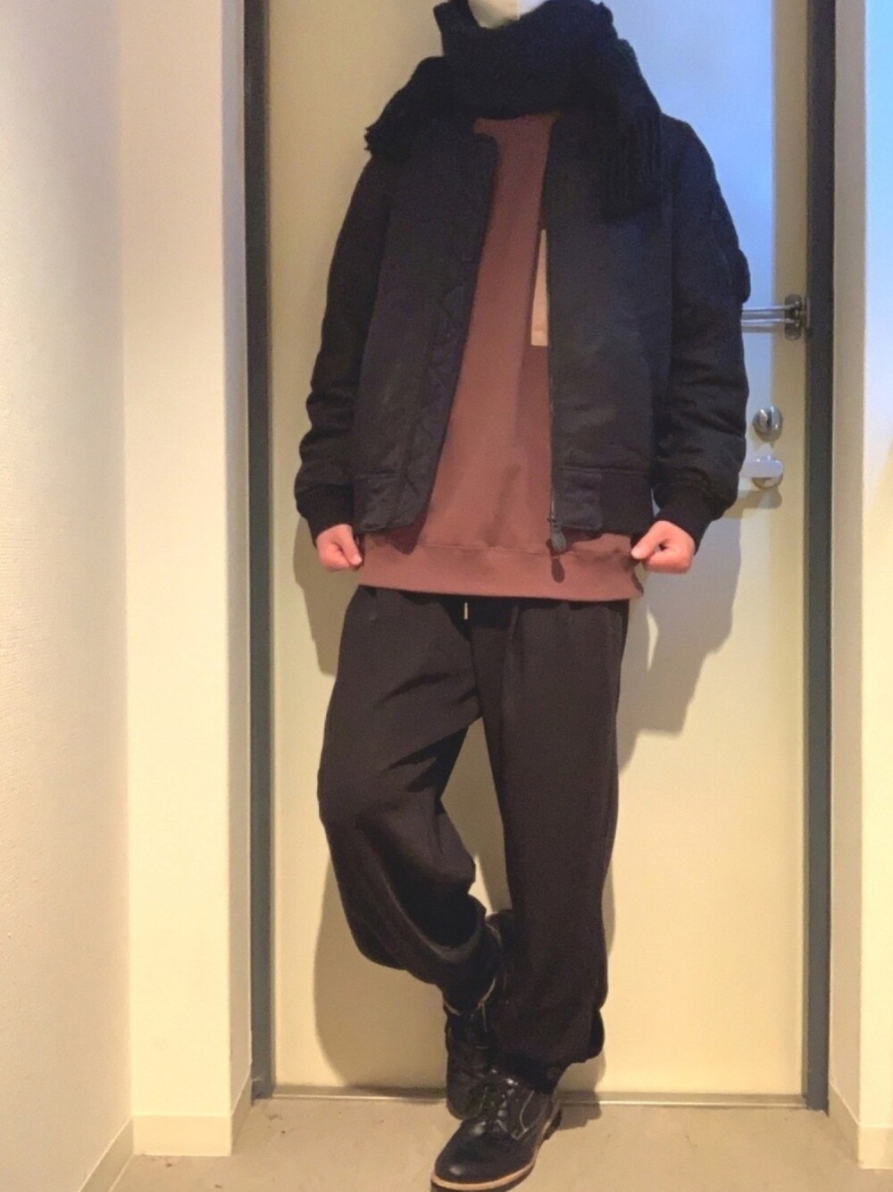 マフラー巻きました🧣 濃いネイビーの色味なので使いやすく、ボリュームがあって暖かいです🙆♂️