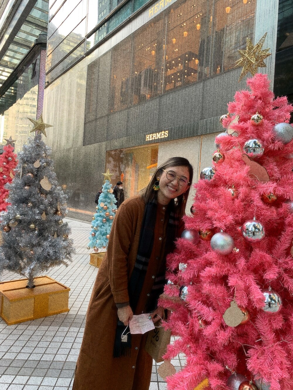 グレー系のマフラーを着用したレディースの冬コーディネートの1枚目の写真
