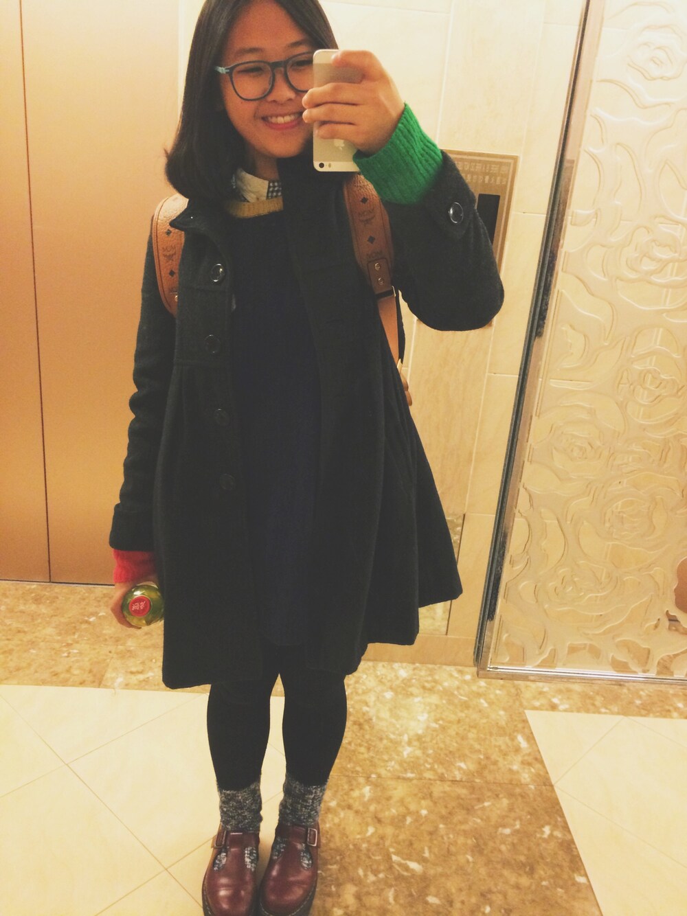 Shirt: cube sugar Cardigan: cube sugar Coat: ichi Leggings:/ Socks: stussy Shoes: Dr martens Bag: mcm