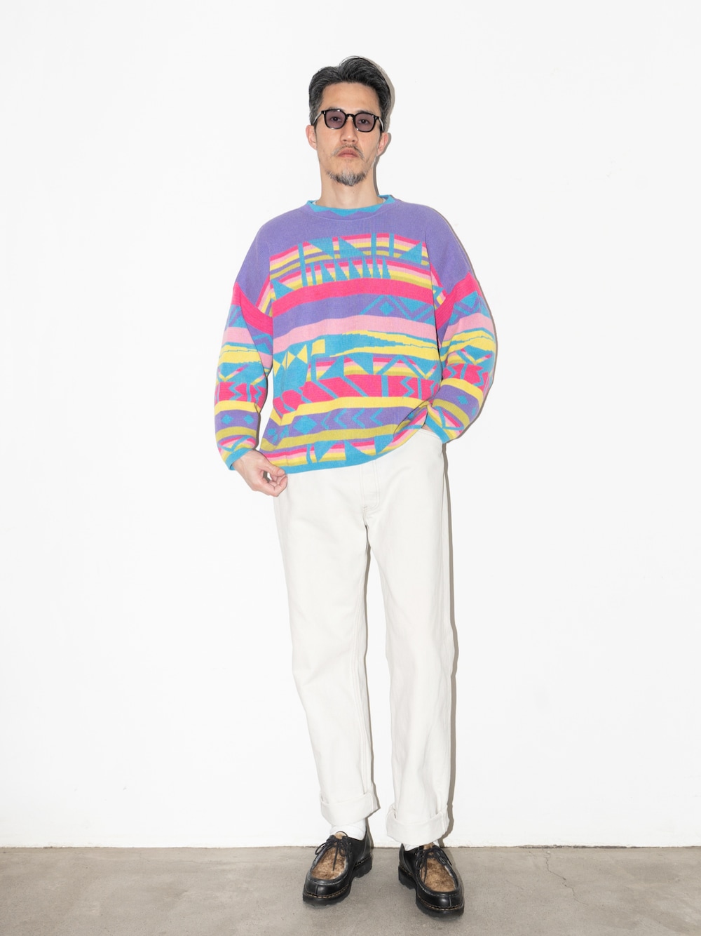 トップスはユーロもののコットンニット パンツは90sのリーバイス501 シューズはパラブーツのミカエル