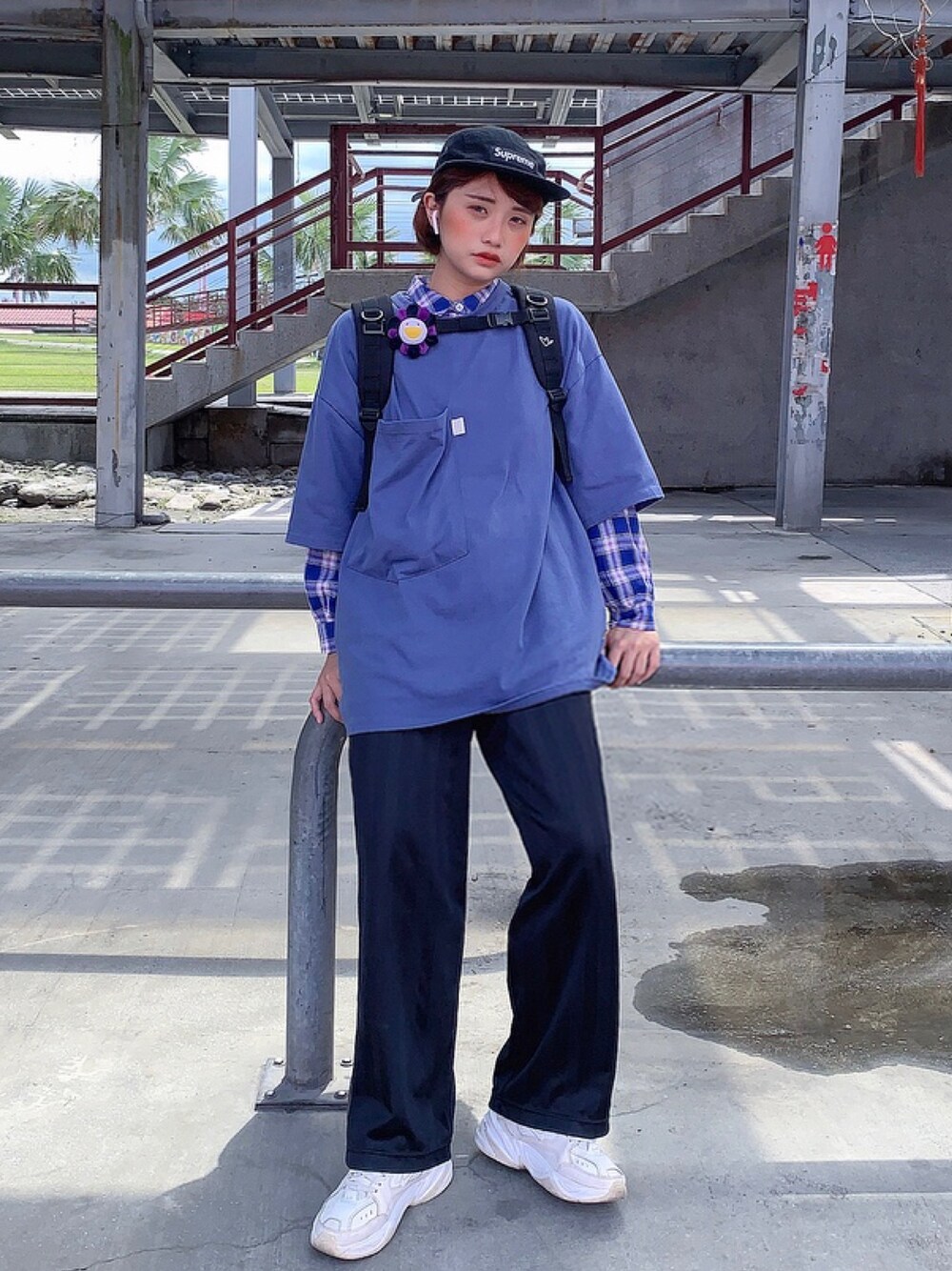 ブラック系のパンツ、ブラック系の帽子を着用したレディースの春コーディネートの1枚目の写真
