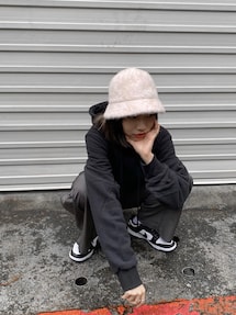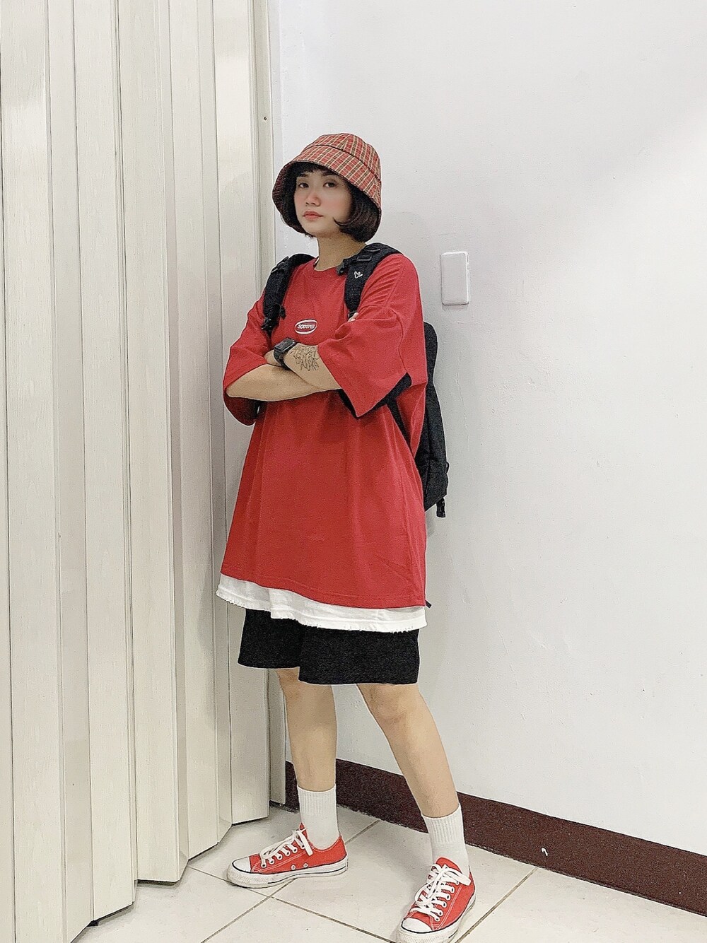 レッド系のシューズを着用したレディースの夏コーディネートの1枚目の写真