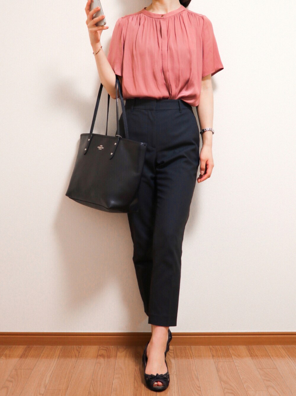 昨日の服装👗 トップスのピンクの色味がすき ◎ 脇も見えないし、胸元も開きすぎてないし、着ててすごく安心する、、