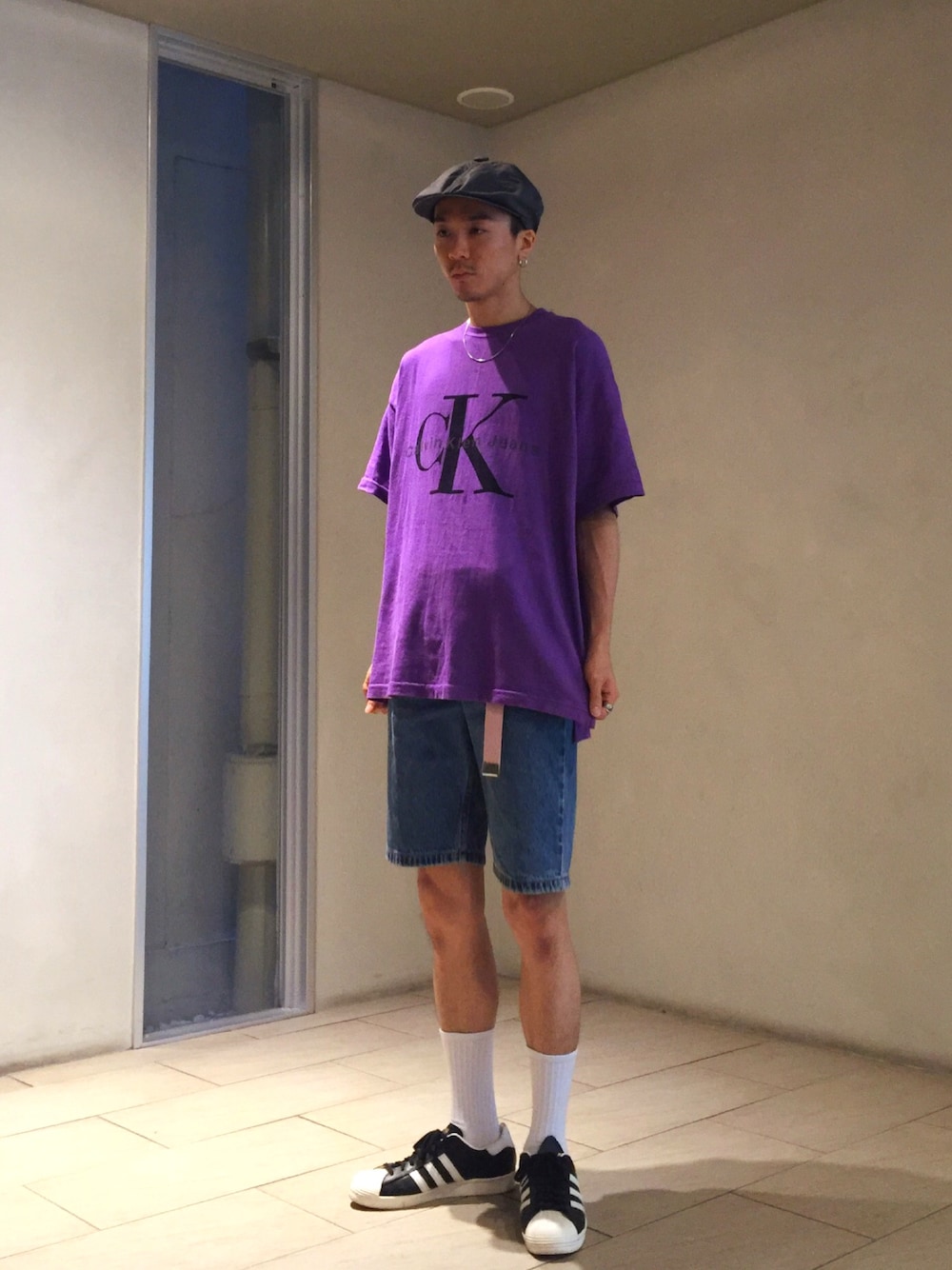 90'sストリート系コーデです! カルバンクラインの紫Tシャツはインパクト大です! あえてハンチングにしました!m(._.)m