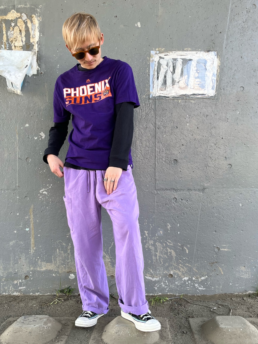 パープルコーデ🟣🟪で合わせてみました。 ビンテージのケビン・ブッカー(フェニックス・サンズ) Tee×ロンTコーデ🏀🔥 NBAのデビン・ブッカー(Devin Booker)選手❗️ 1年目からコービー、マグレディ、レブロン、ガーネット、デュラント、ハワードらに次ぐ10代の選手が1試合19得点以上を記録した選手になり、NBAオールルーキーチームの1stチームに選出され、 2年目には2017年3月24日のボストン・セルティックス戦で70得点を記録し、リーグ史上6人目となる 「1試合70得点」を達成✨ その後もチームのエースとして、サンズを引っ張っていスキルフルな選手です🥹✨ そんなヒーローと合わせるのは、ゆるだぼパンツ🫰🏼締め付けなくて僕はすきだから🫣 ・ ・ ・ 僕が着用しているTeeシャツはInstagramにて 「am3:41」から購入できます🏀🙌🏻 一点モノのレアなので是非お早めに❗️ お気軽に見にきてください〜😆 NBA🏀に関する古着屋「am3:41」 Instagram👉 @am3:41 で検索❕ --------------------------------- 個人Instagram 👉@gomashiopunch YouTube 👉kinemarge(キネマージュ)
