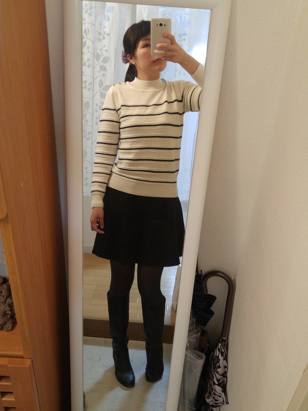 まーちゃんのニット/セーター「編み柄ボーダーハイネックプルオーバー」を使ったコーディネート
