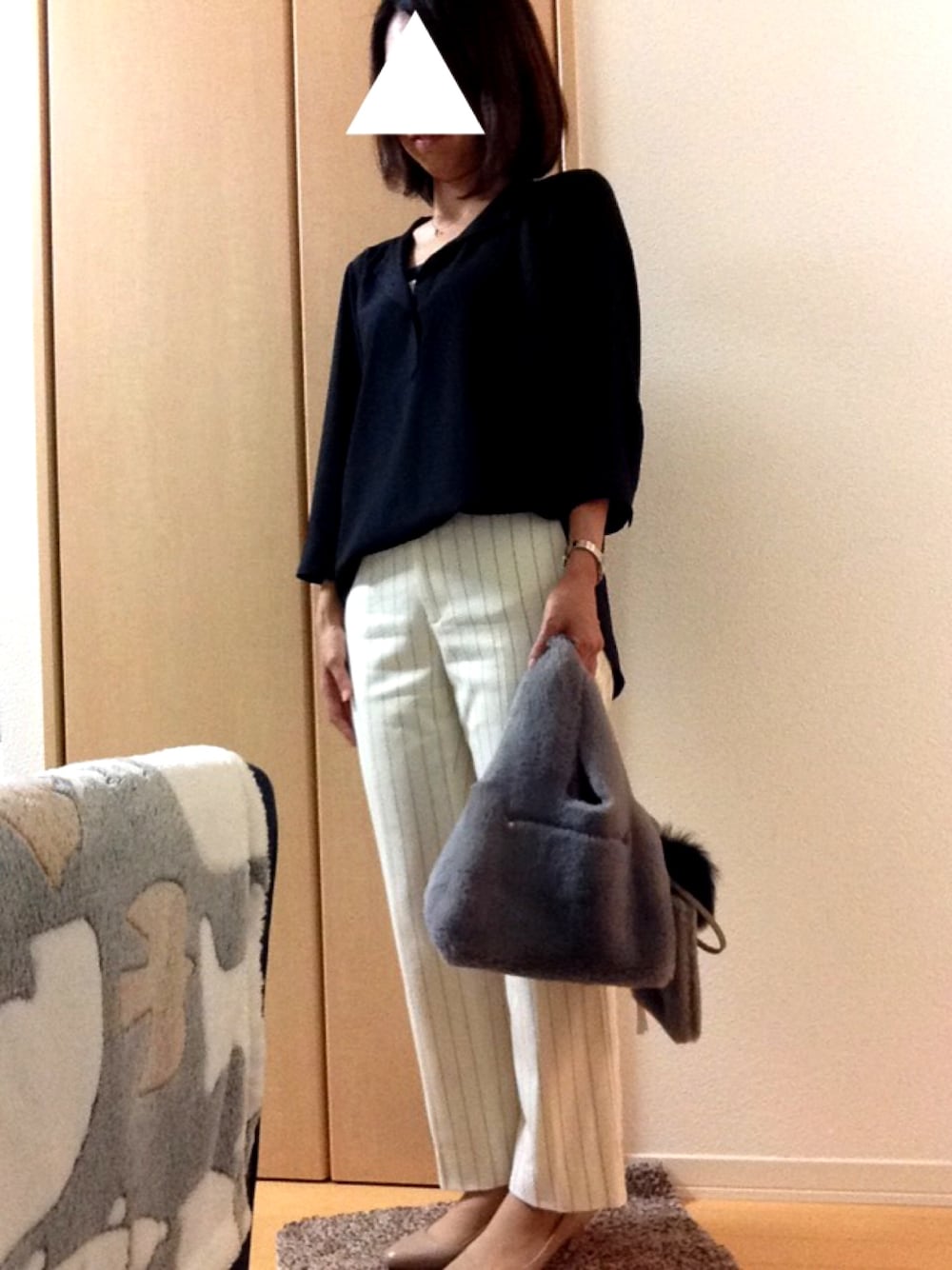 今日は暑い💦 ブラウスはユニクロSALEで。ヘンリーネックを折り曲げてアレンジ。 お気に入りのふわもこバッグとともに👜