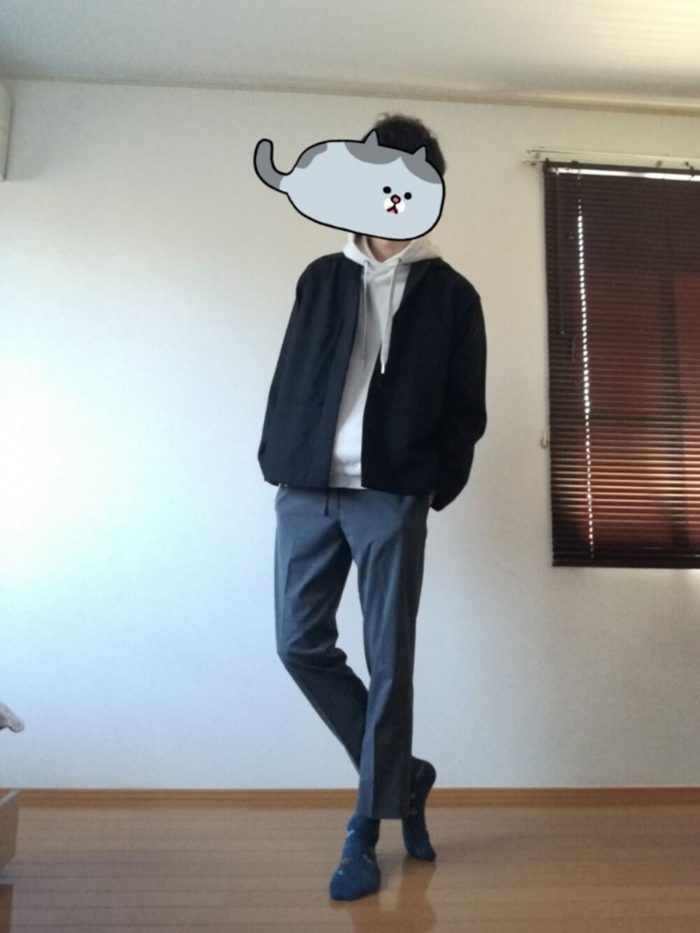 恐竜柄の青い靴下がすちすち 軽めのモノトーンで春感をプラス しっかりめの生地なのに手触りしっとりのパーカーです、着れる矛盾ですね