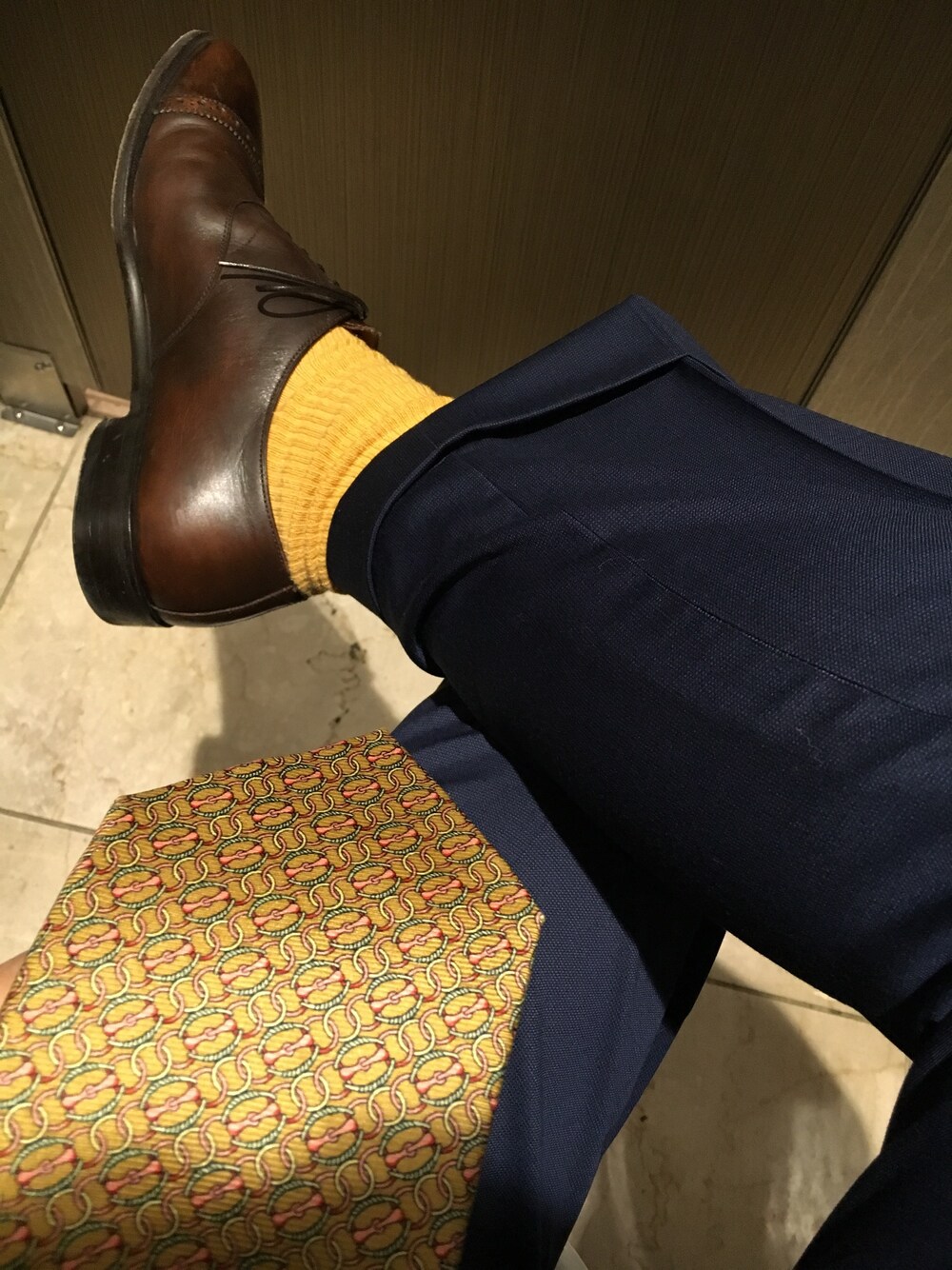 今日は黄色の靴下と黄色のネクタイを合わせてみました。 カッターシャツもUNIQLOです。