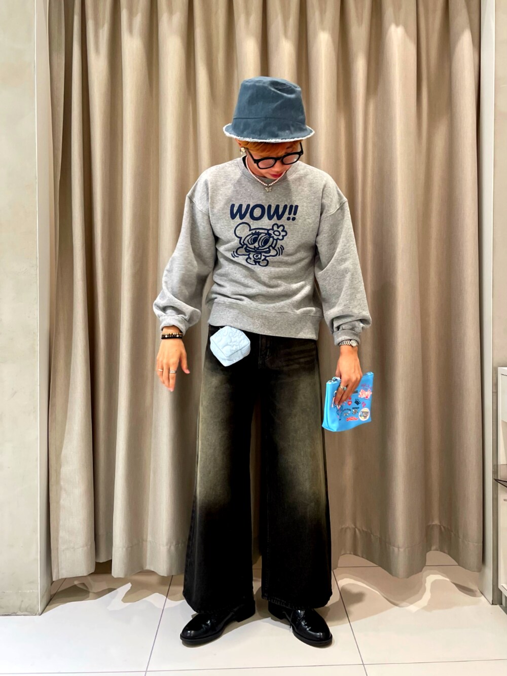 皆さんこんにちはアーモンドです! 今回のテーマは、WOW!コーデです 上のスウェットがレディースのコラボスウェットで、下の青いポーチもコラボ商品の1つです! スウェットは、メンズの方も着られるのでおススメです!