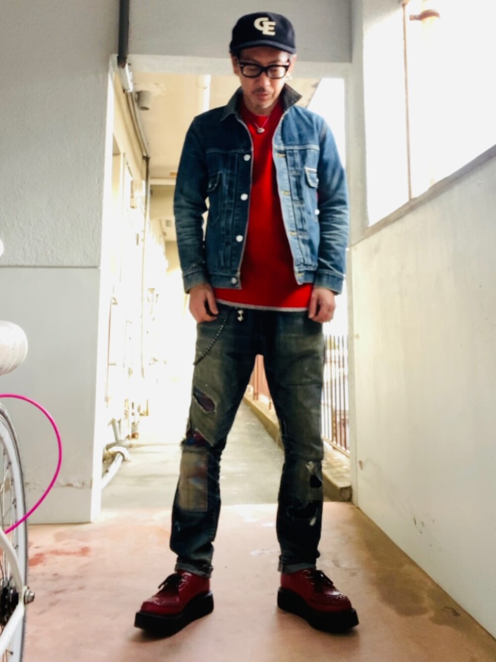 "デニムオンデニムにラバーソール"