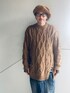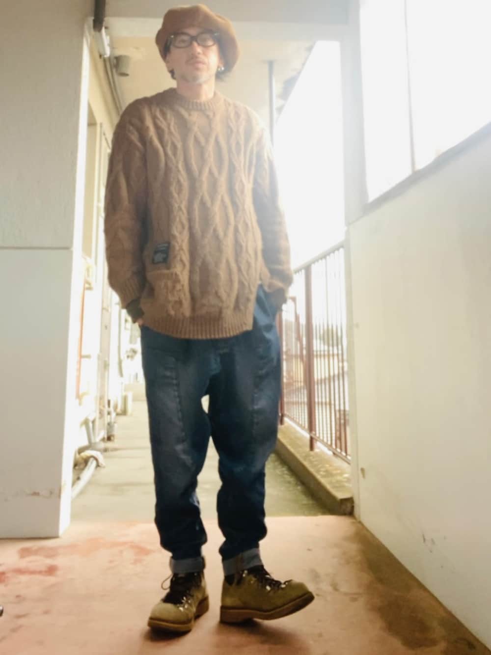 "コーデュロイのビッグベレー帽とケーブルニット" 逆光がすぎる